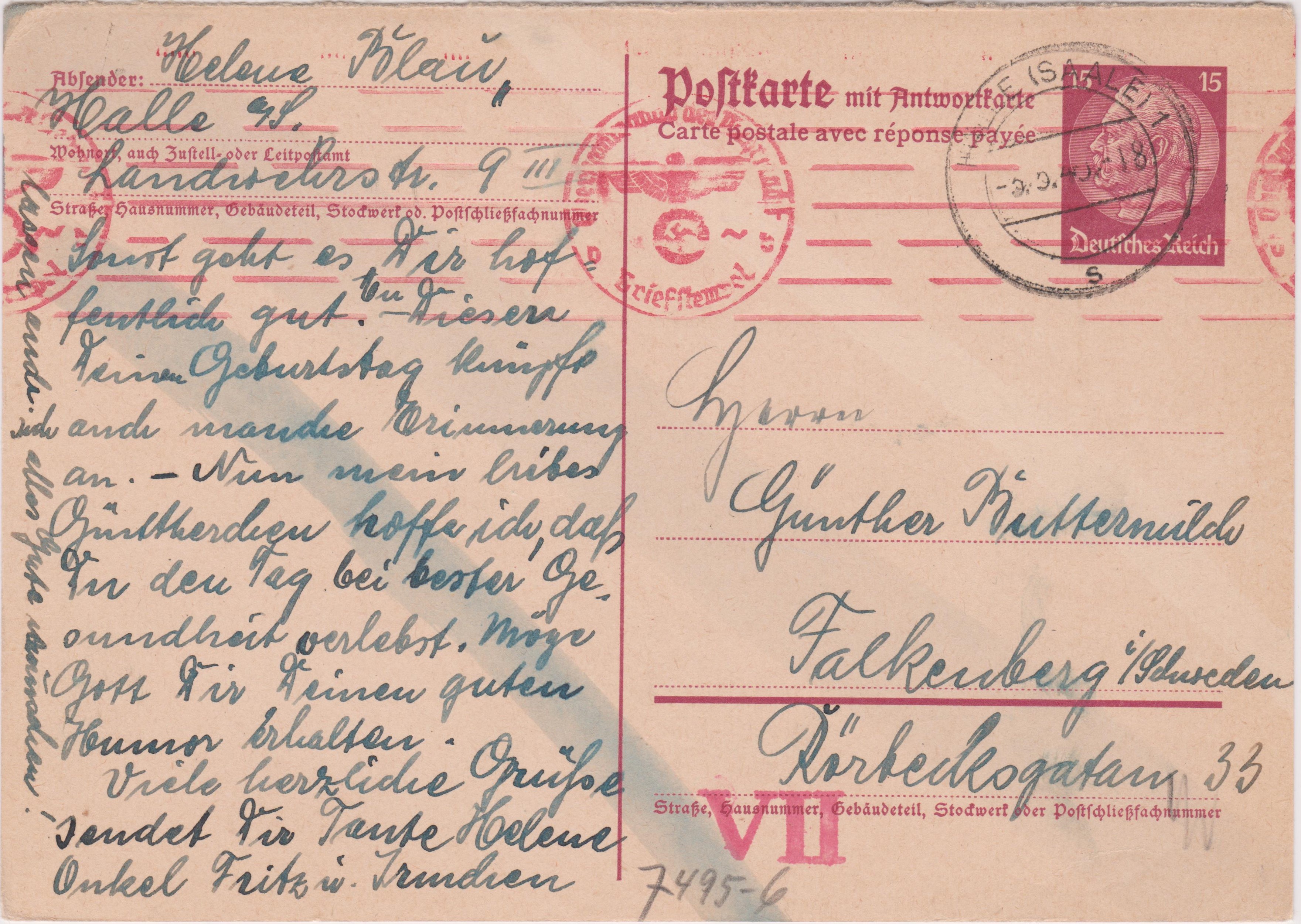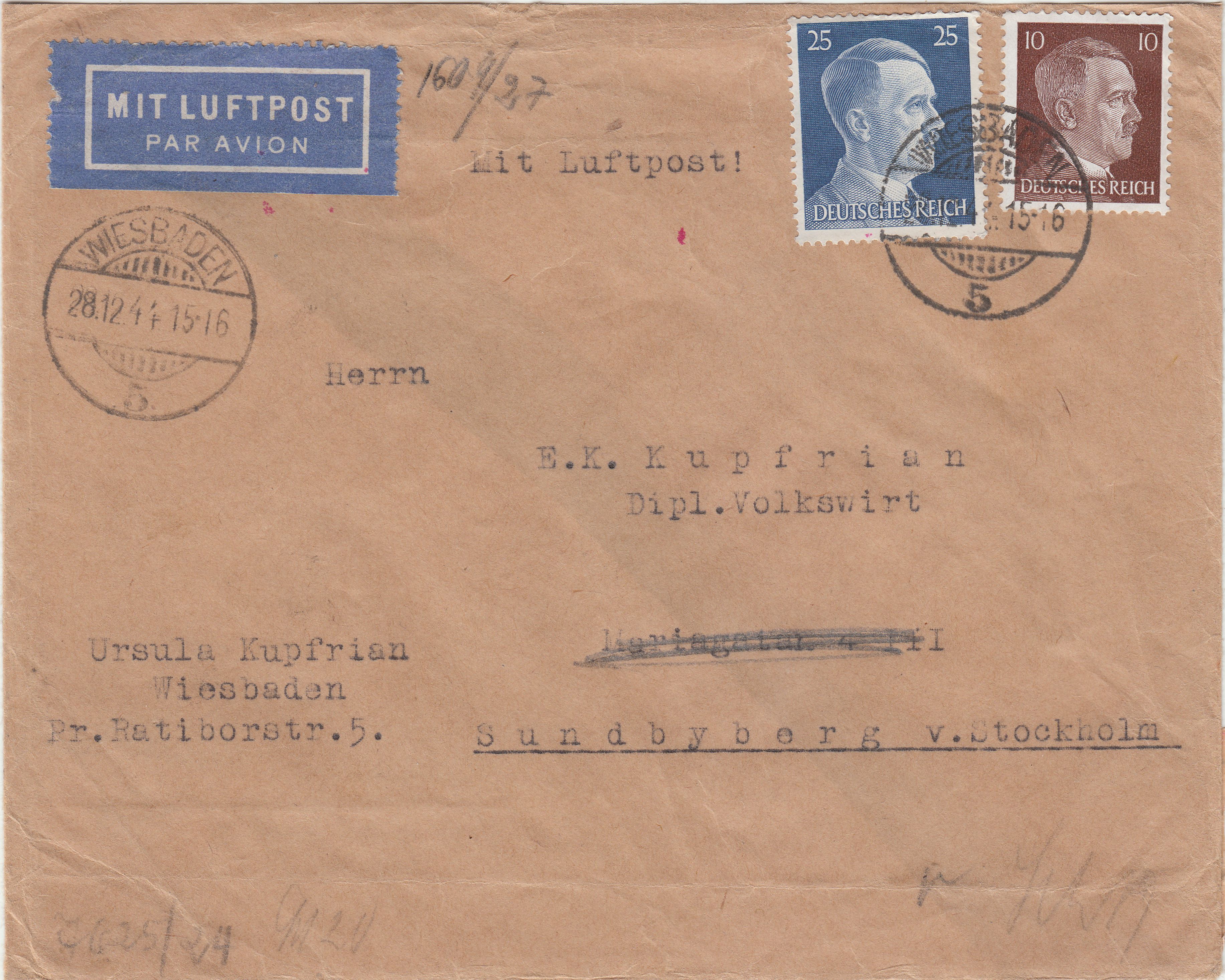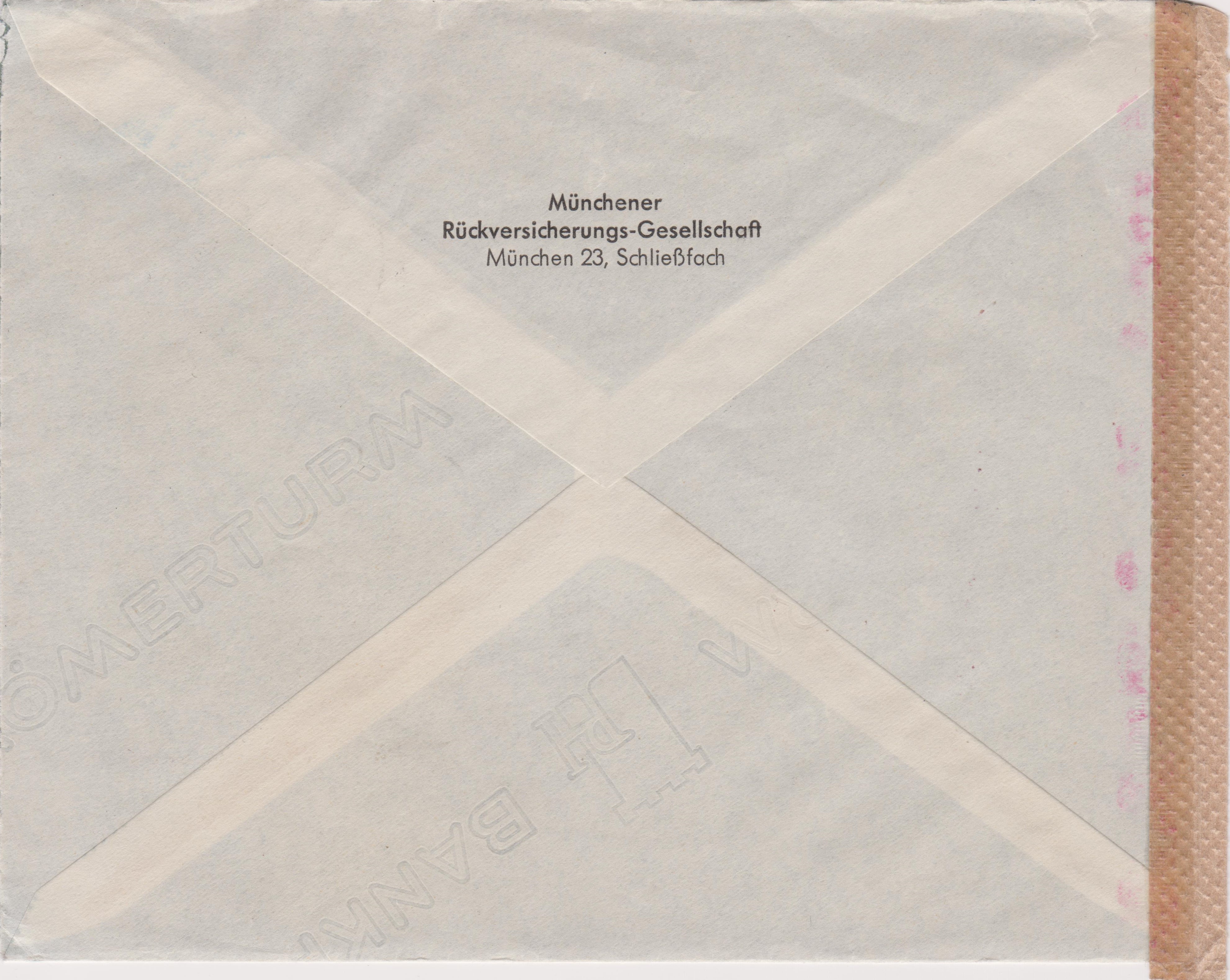 Das Porto von 45 Pf setzt sich zusammen aus dem Porto für eine Postkarte ins Ausland, 15 Pf, sowie der Einschreibgebühr in Höhe von 30 Pf.