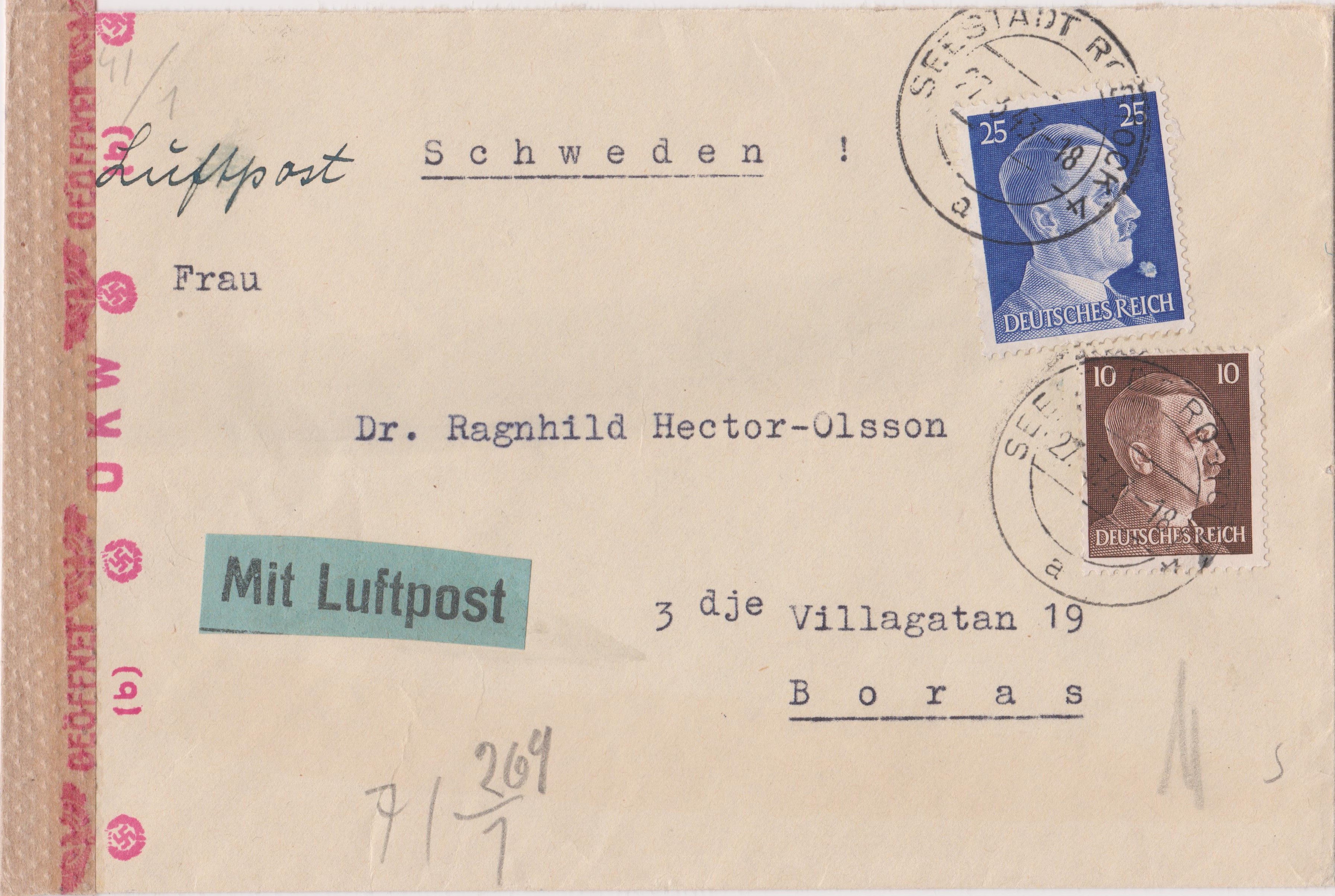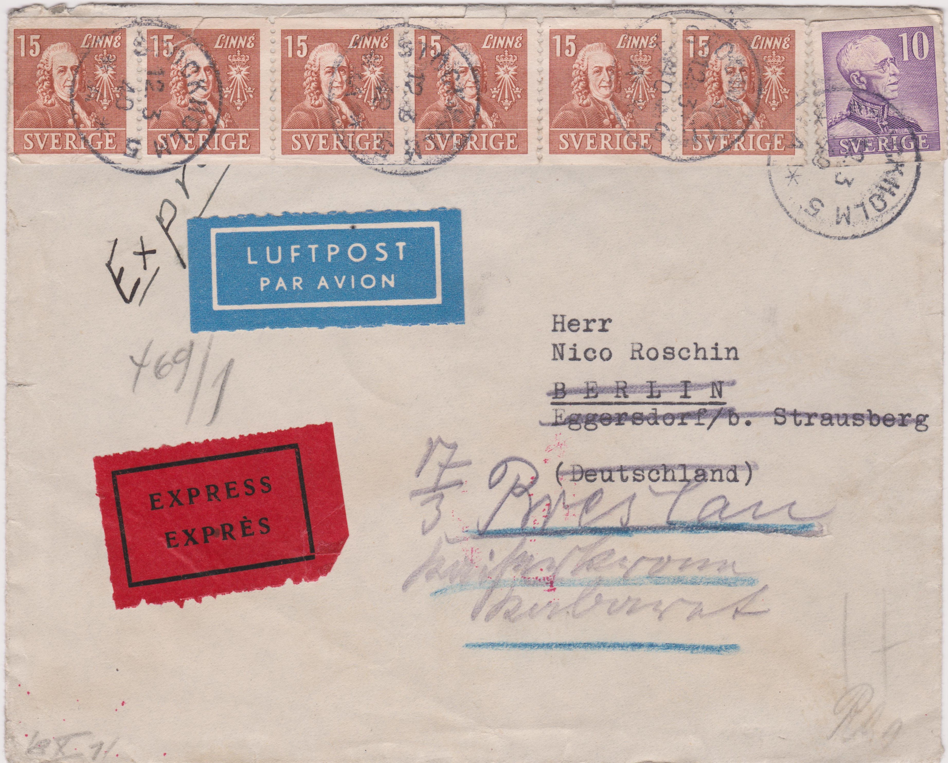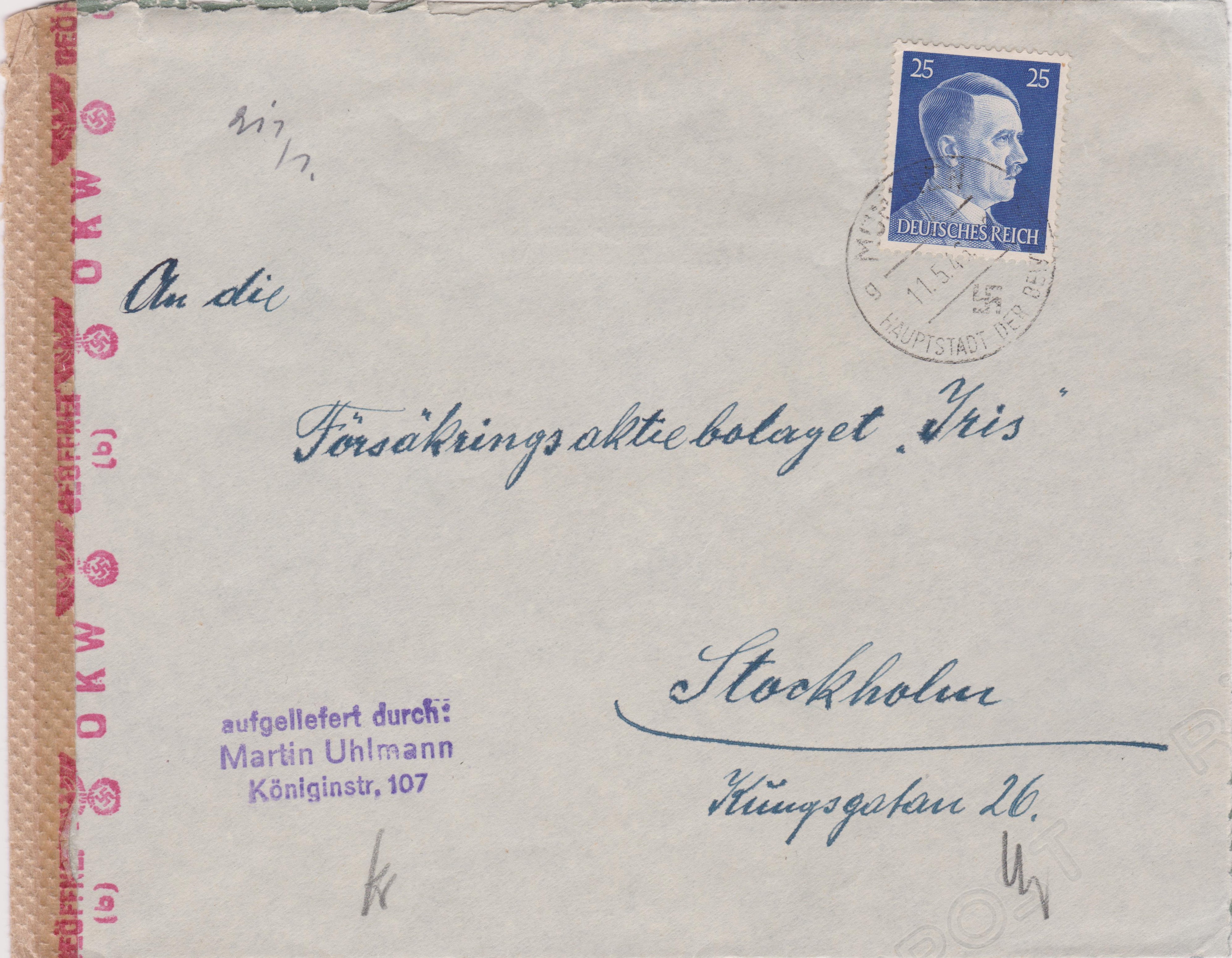 Postkarte per Einschreiben, aufgegeben am 22.06.1943 in BERLIN NW 6, adressiert nach "STOCKHOLM SCHWEDEN":