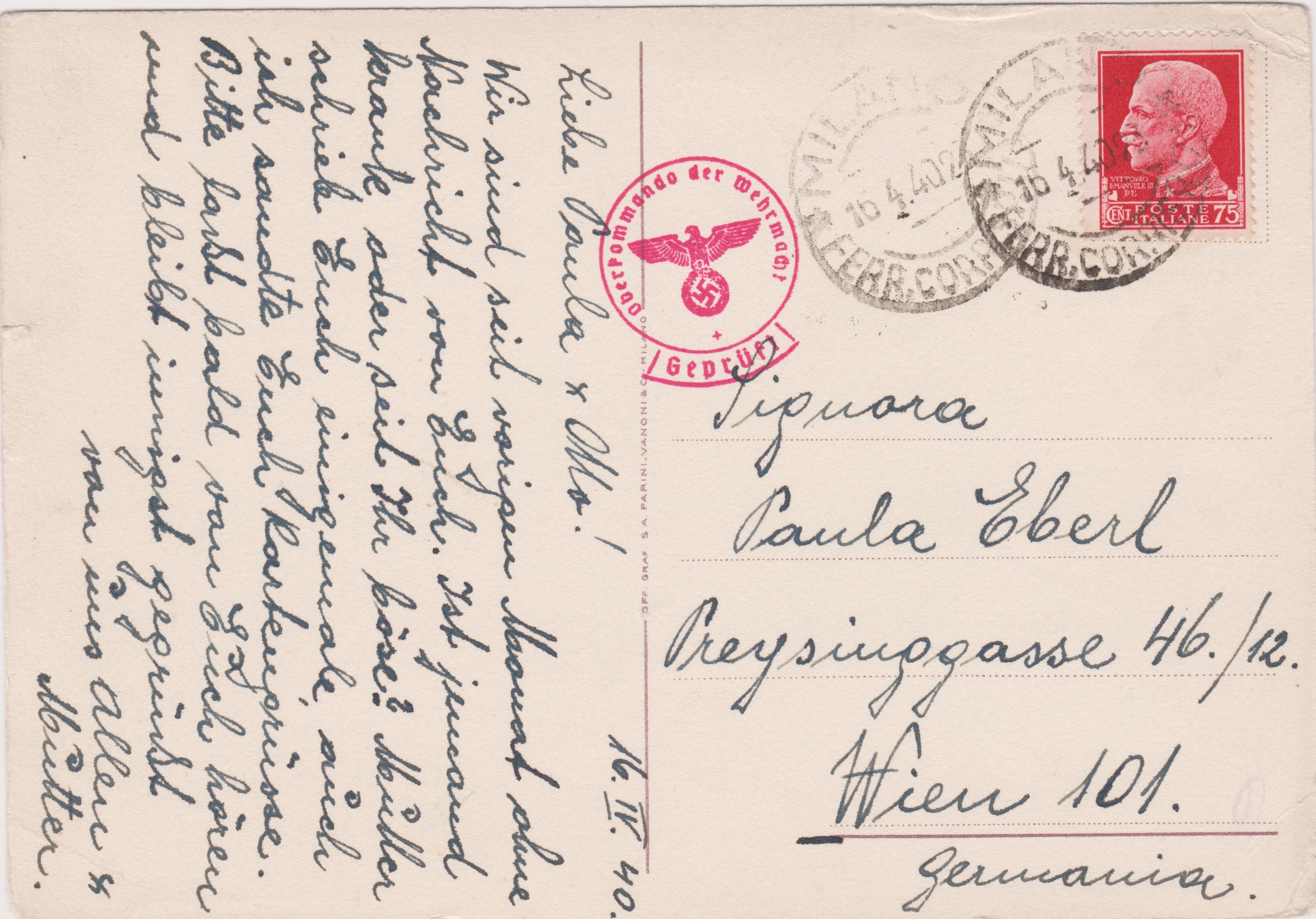 Postkarte, adressiert nach Wien, aufgegeben am 16.04.1940 in "MILANO":