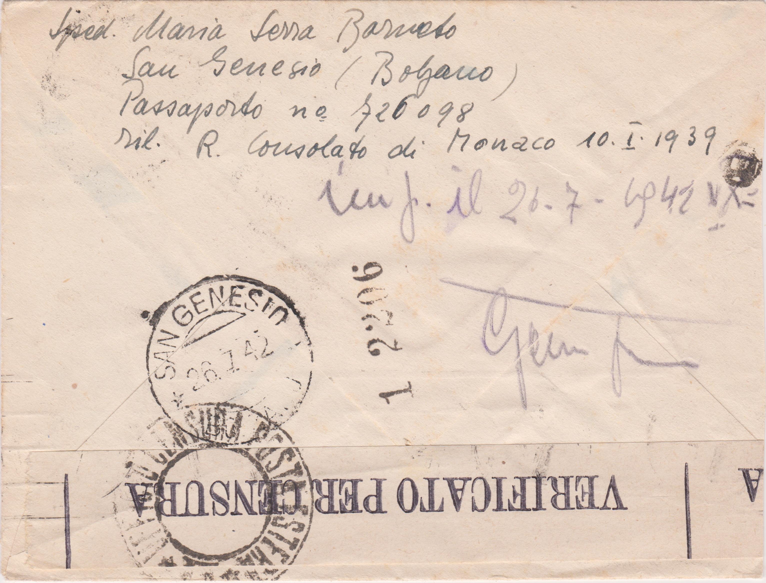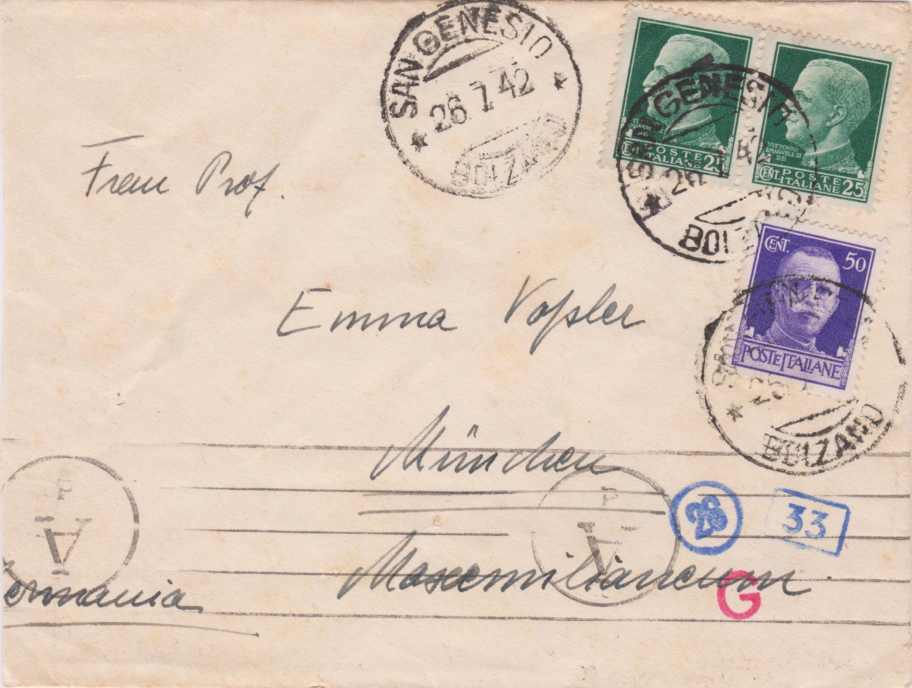 Dieser nach München adressierte Brief wurde am 26.07.1942 in Italien in "SAN GENESIO BOLZANO" aufgegeben: