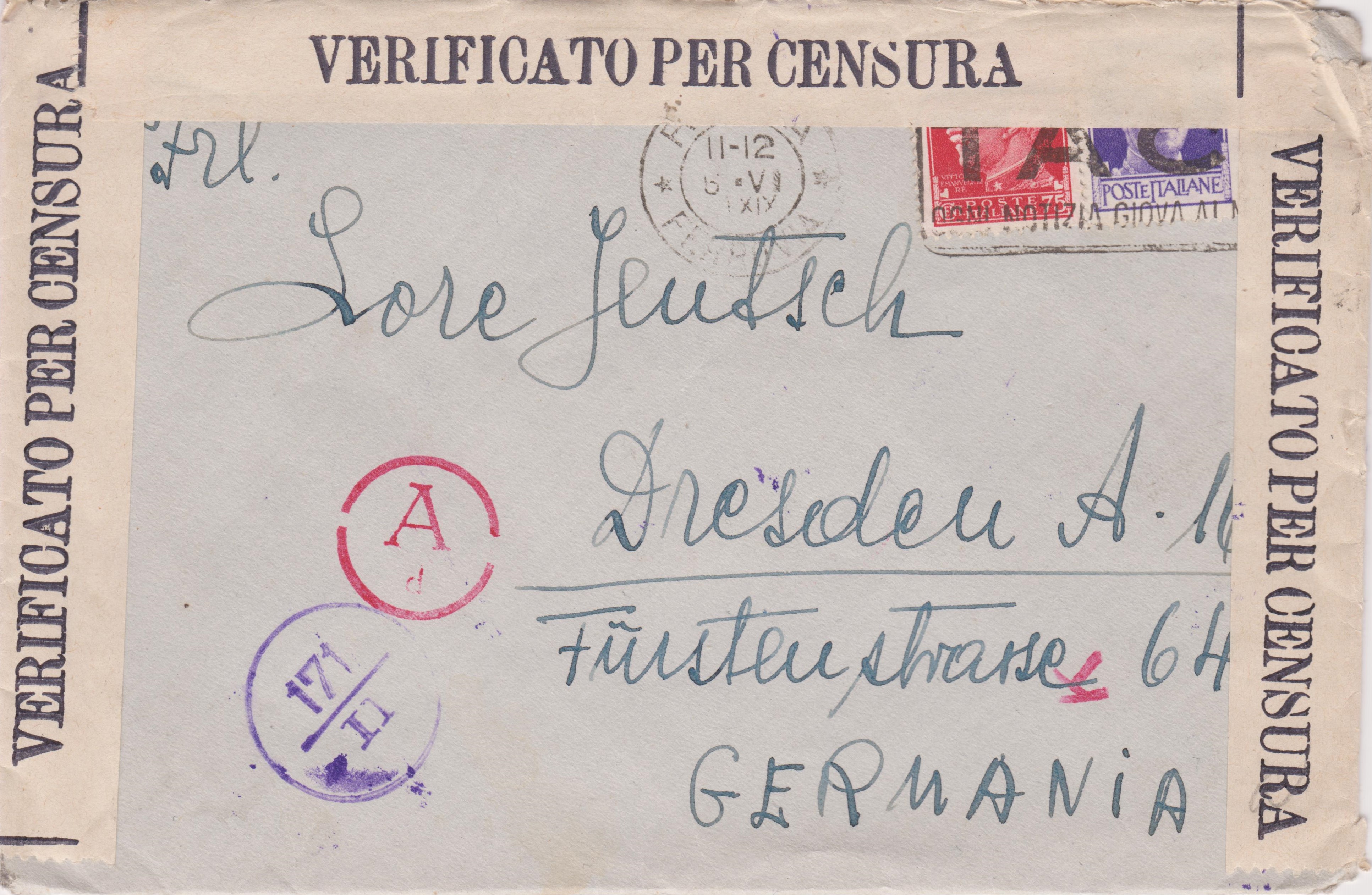 Der Brief lief in Italien durch die Zensurstelle, wurde dreiseitig geöffnet und nach erfolgter Prüfung mit Verschlußstreifen "VERIFICATO PER CENSURA" wieder verschlossen, was italienische Prüfstempel dokumentieren.