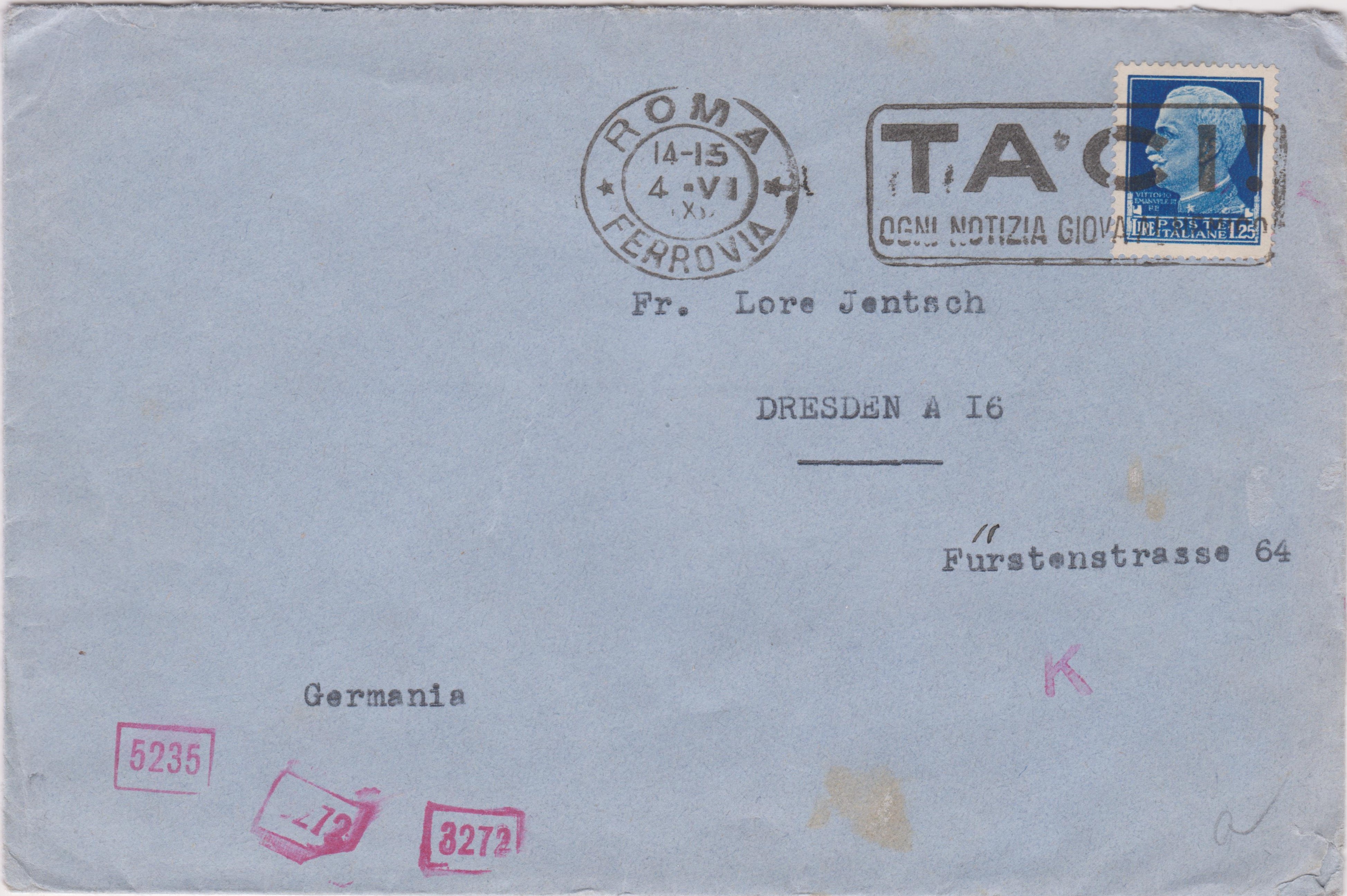 Dieser in Rom aufgegebene, nach Dresden adressierte Brief wurde der für Post aus Italien zuständigen ABP München zugeleitet:
