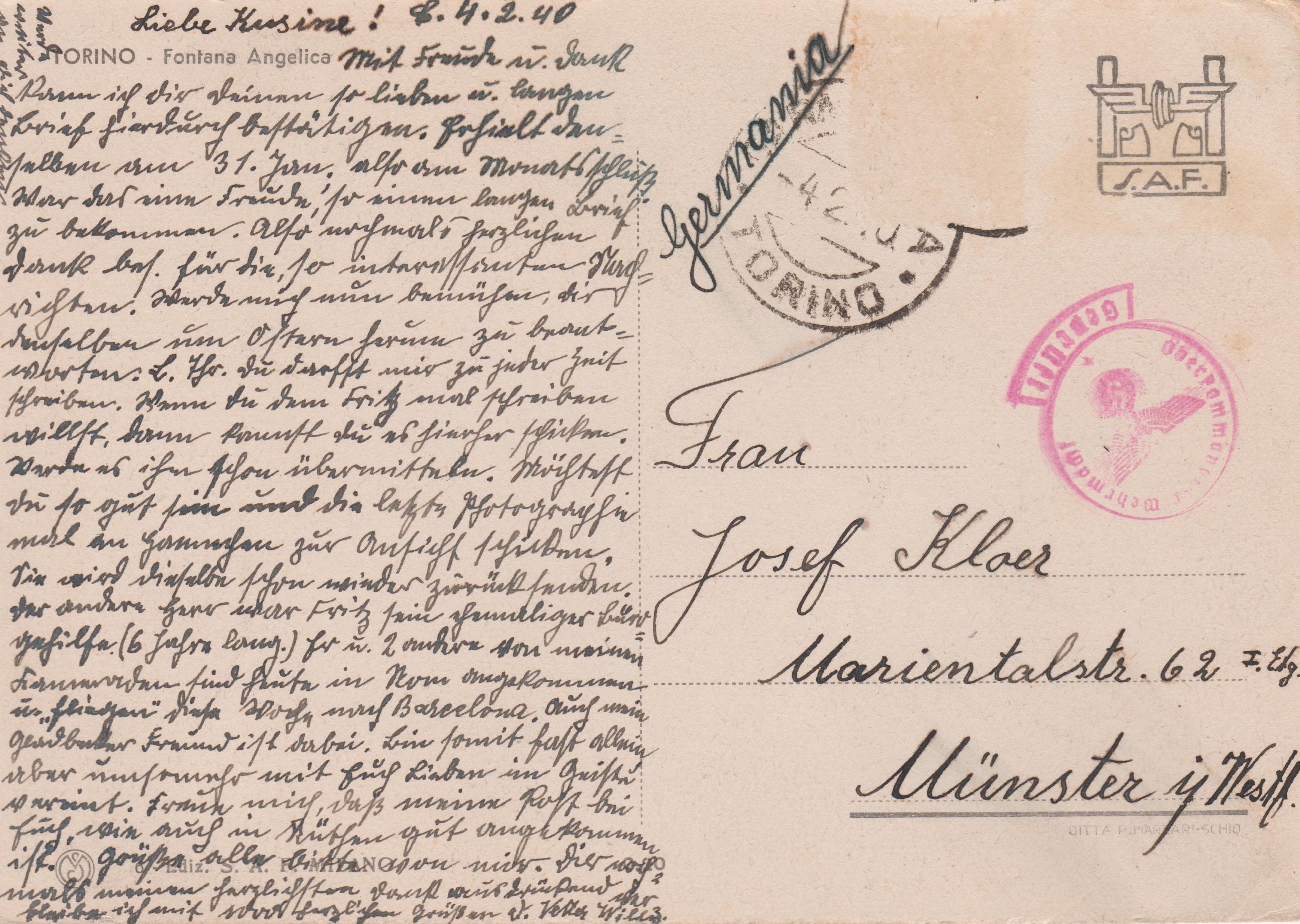 Postkarte, adressiert nach "Münster in Westfalen", aufgegeben am 04.02.1940 in "TORINO":