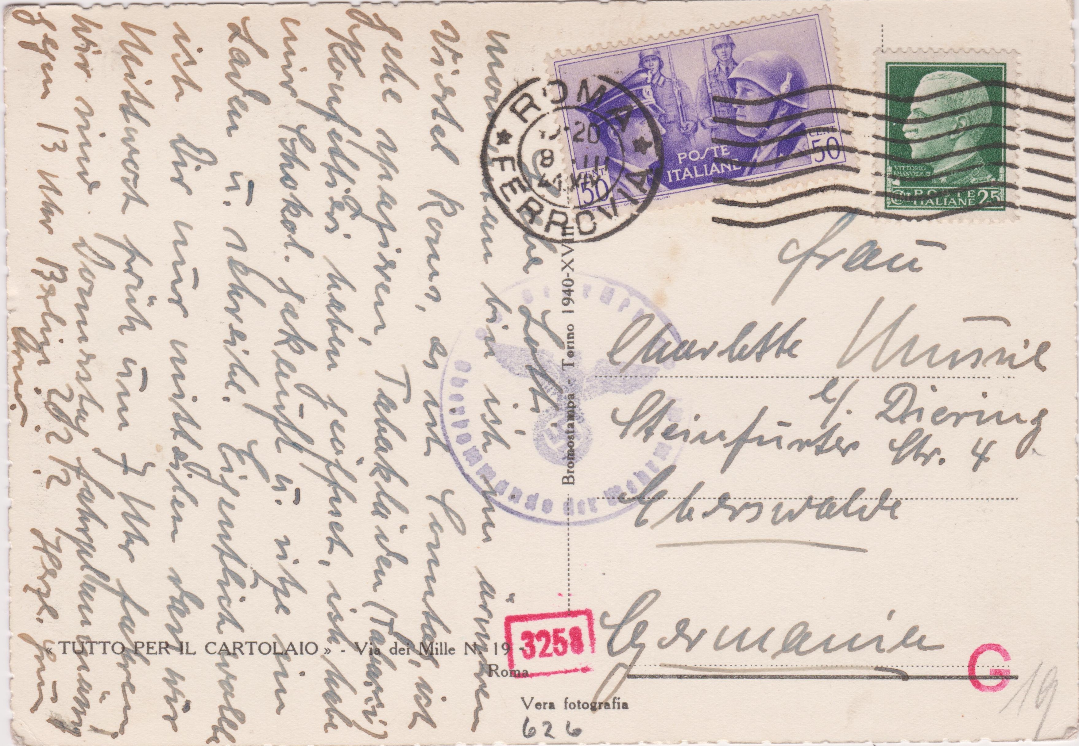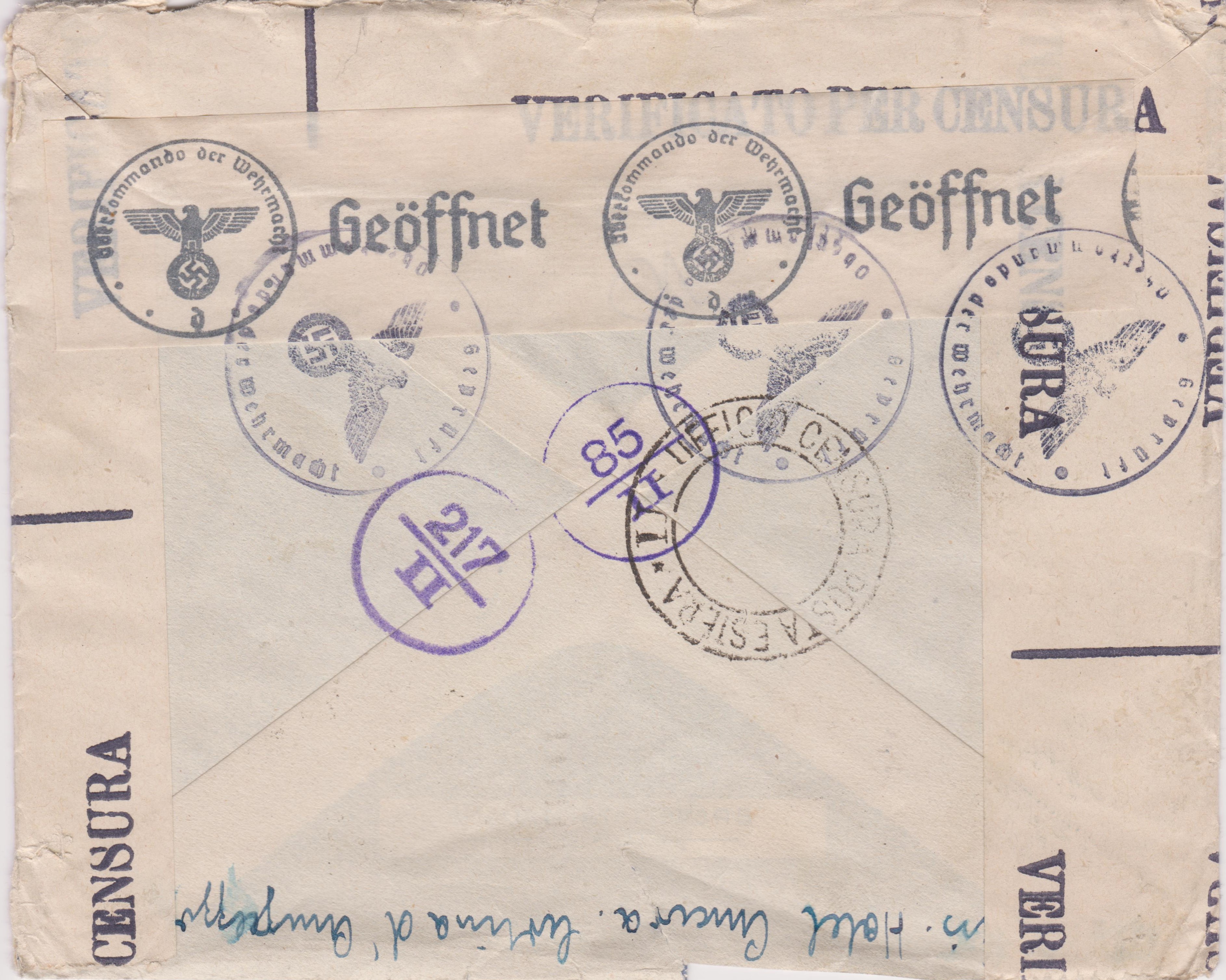 Beide Postkarten wurden der für Post von und nach Italien zuständigen Auslandsbriefprüfstelle München zugeleitet, wo ein Prüfstempel "Oberkommando der Wehrmacht Geprüft", Landsmann DP1.1, abgeschlagen wurde.