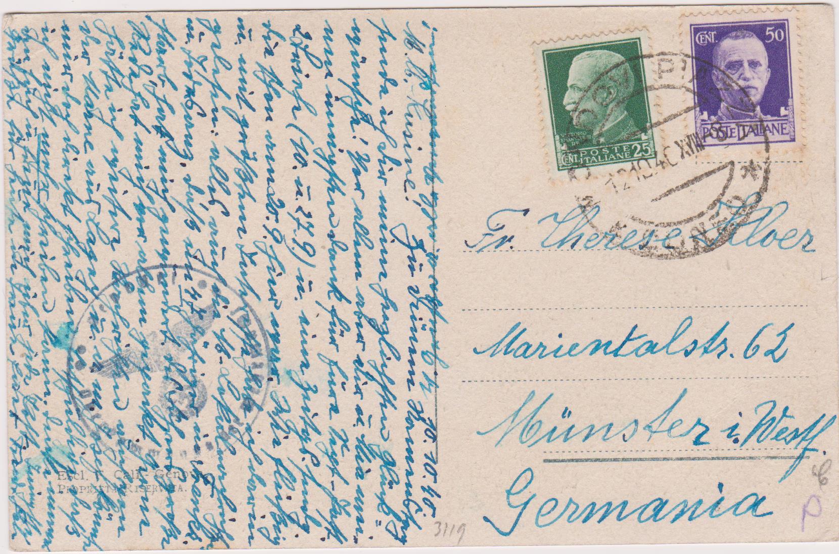Ansichtskarte aus Genua, aufgegeben in Italien am 12.10.1940, adressiert nach "Münster in Westfalen":