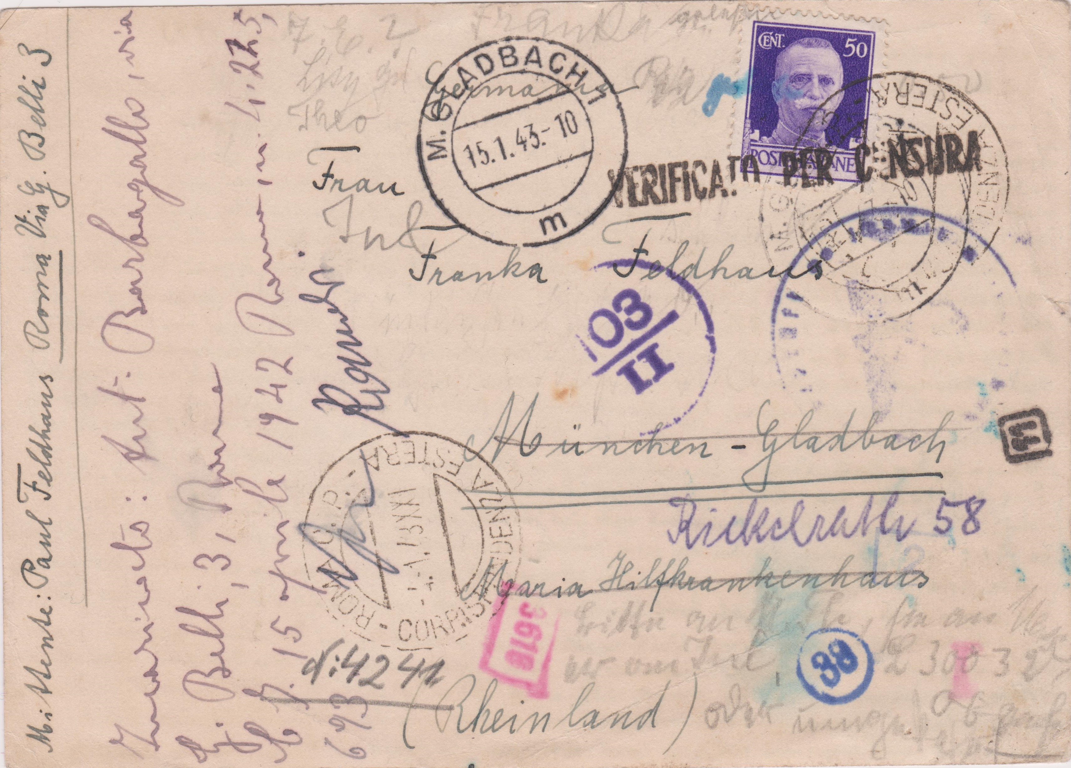 Postkarte aus Italien, geschrieben am 02.01.1943, aufgegeben in Rom, adressiert nach "München-Gladbach" (meint "Mönchengladbach"!):