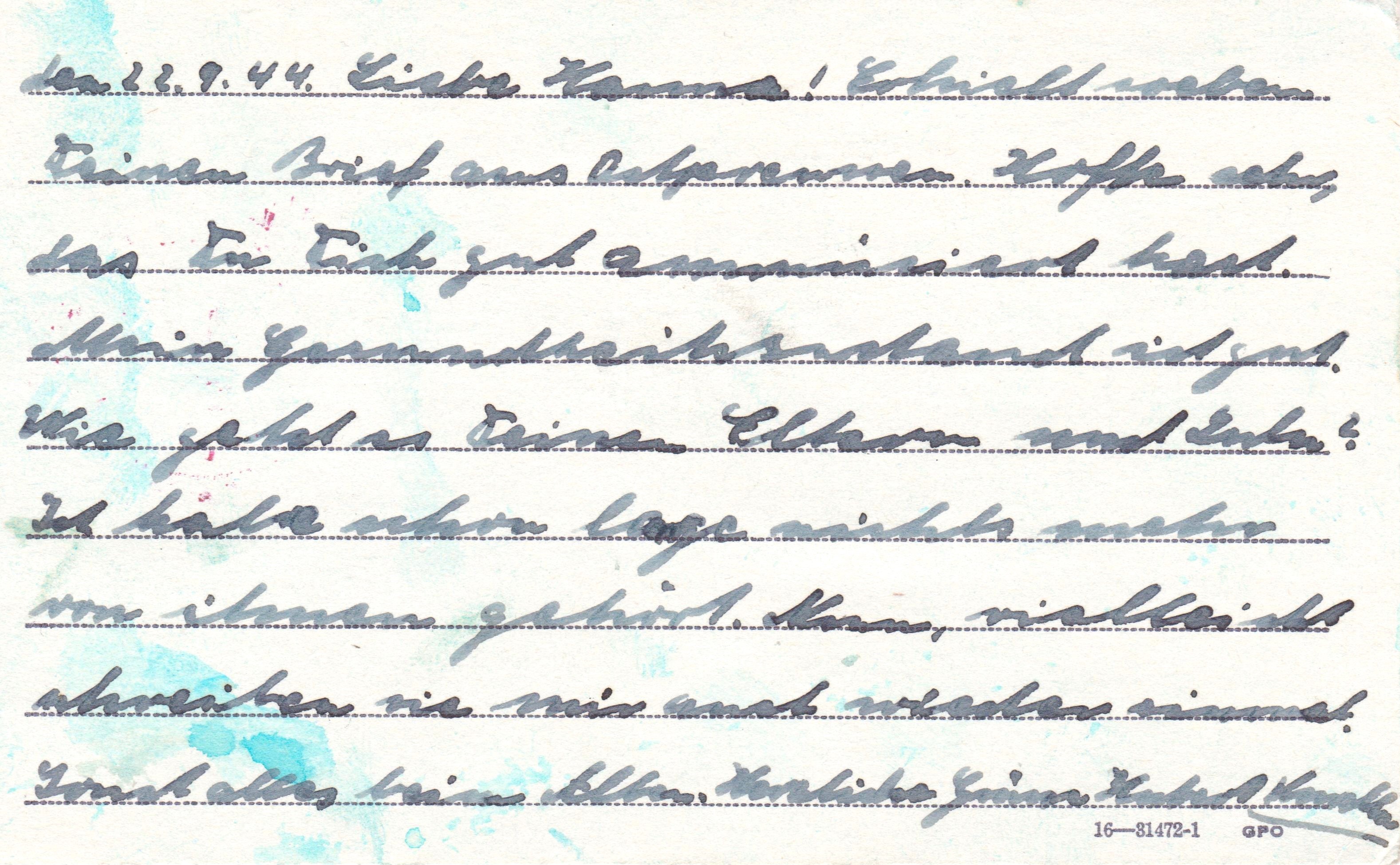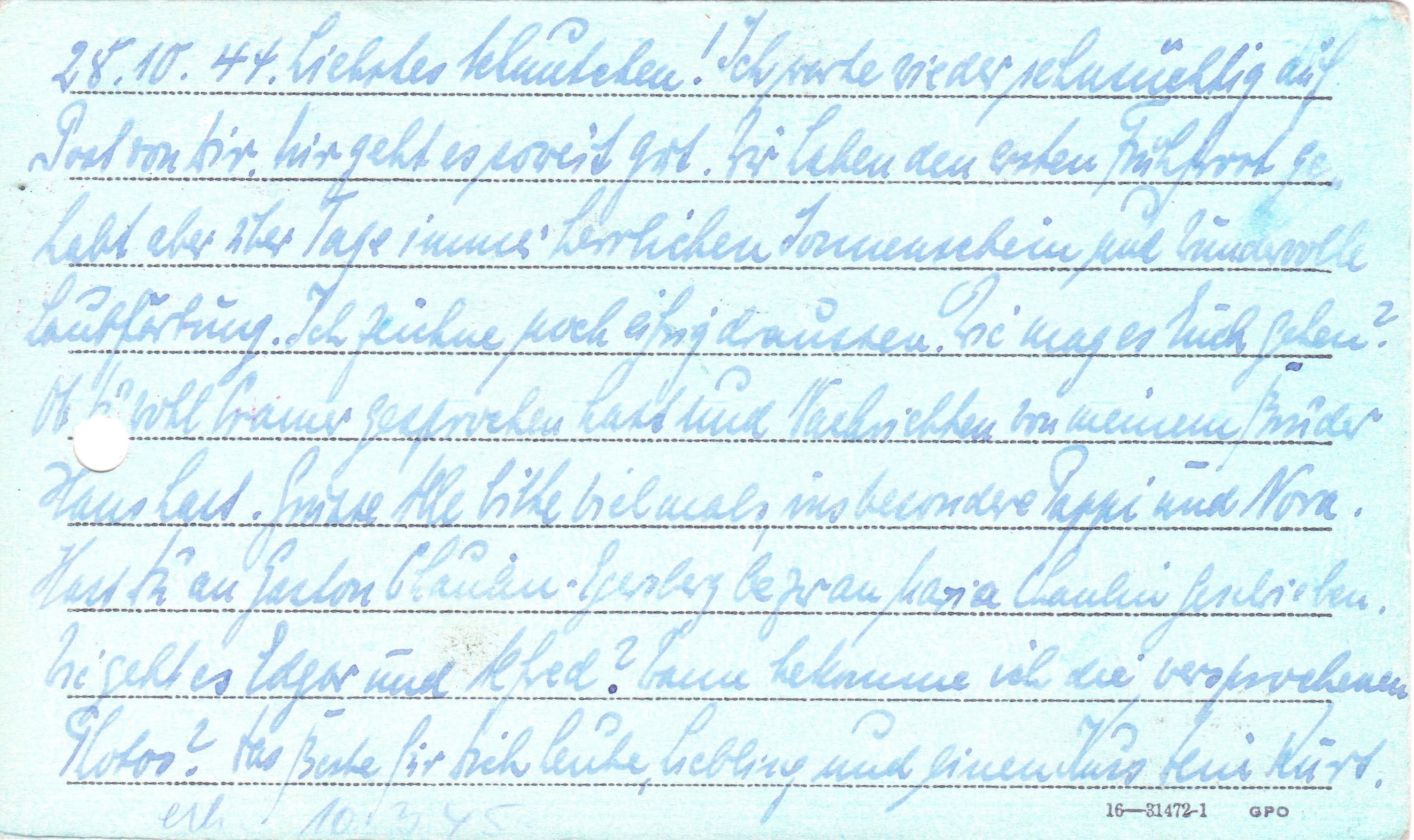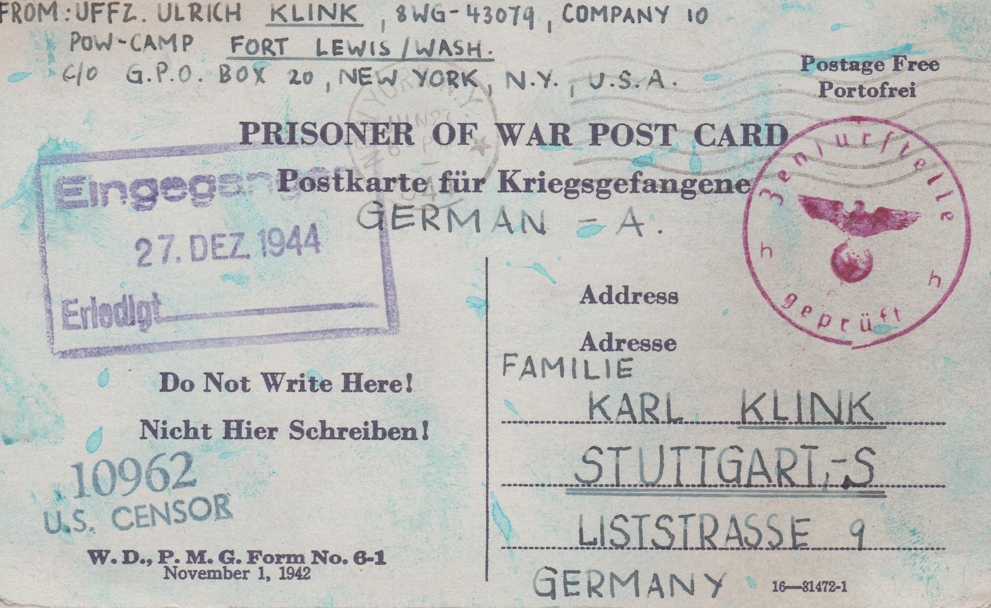Hier als erstes Beispiel eine nach Stuttgart adressierte Kriegsgefangenensendung in Kartenform, die im Kriegsgefangenenlager "Fort Lewis" am 30.05.1944 geschrieben wurde: