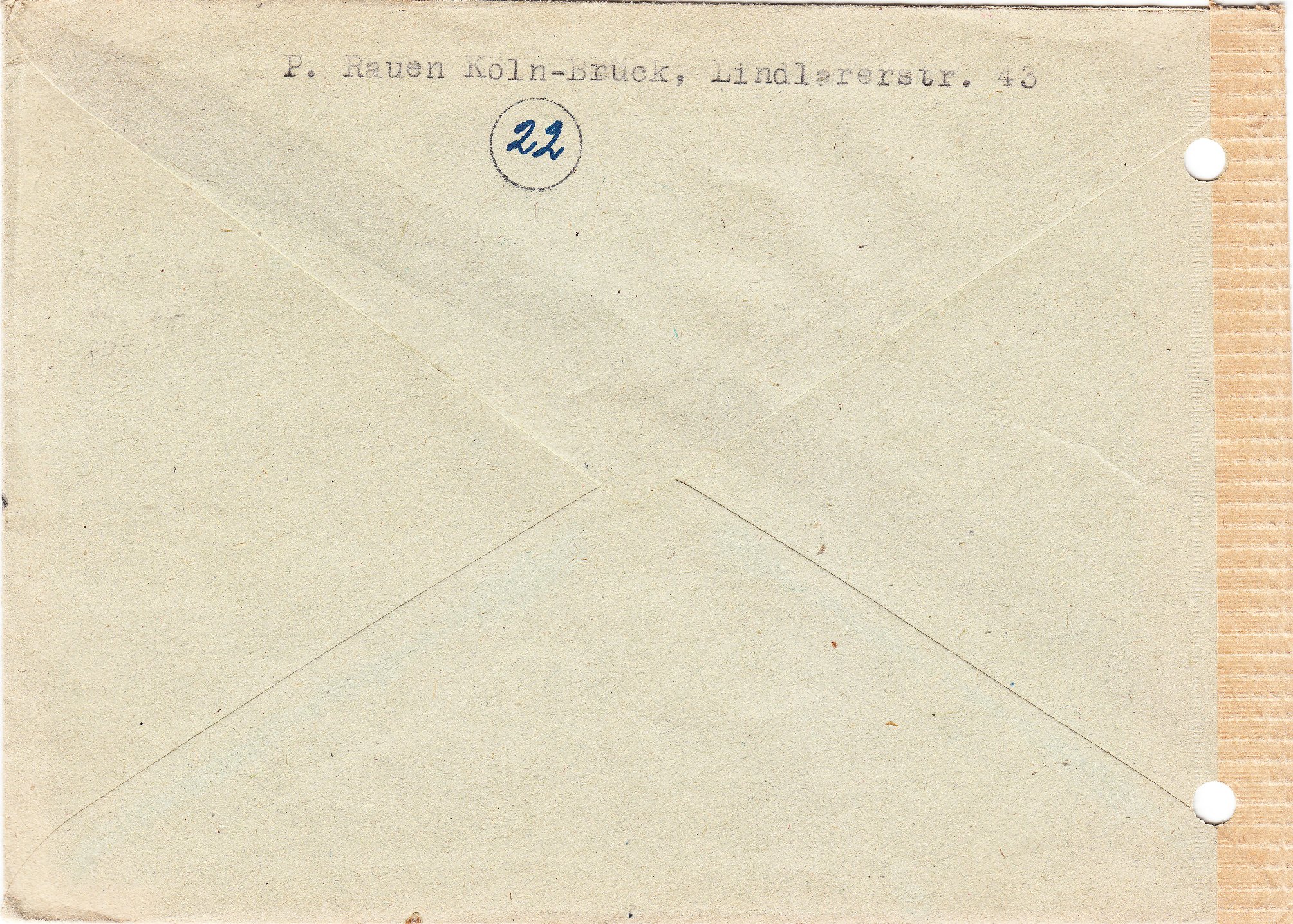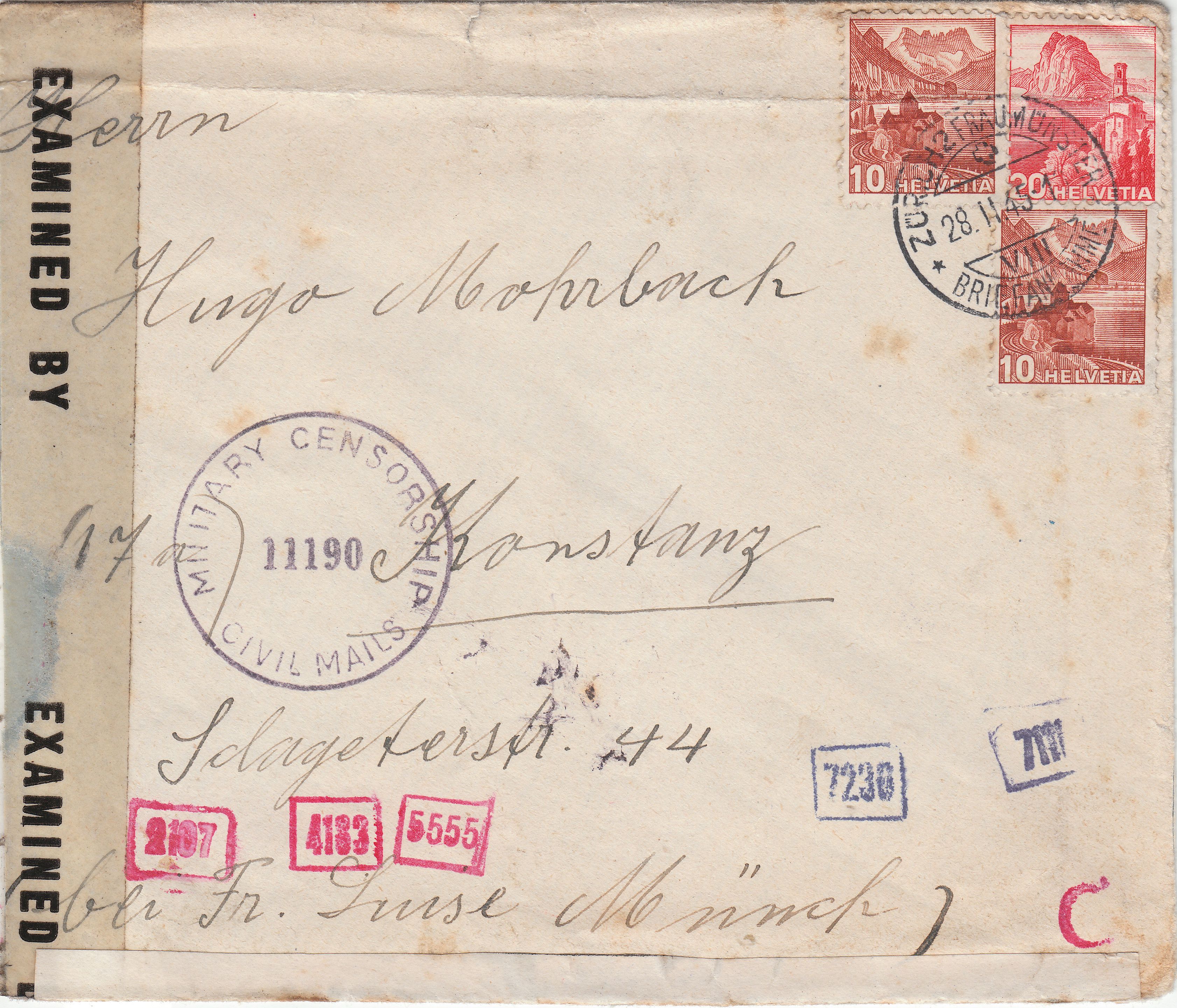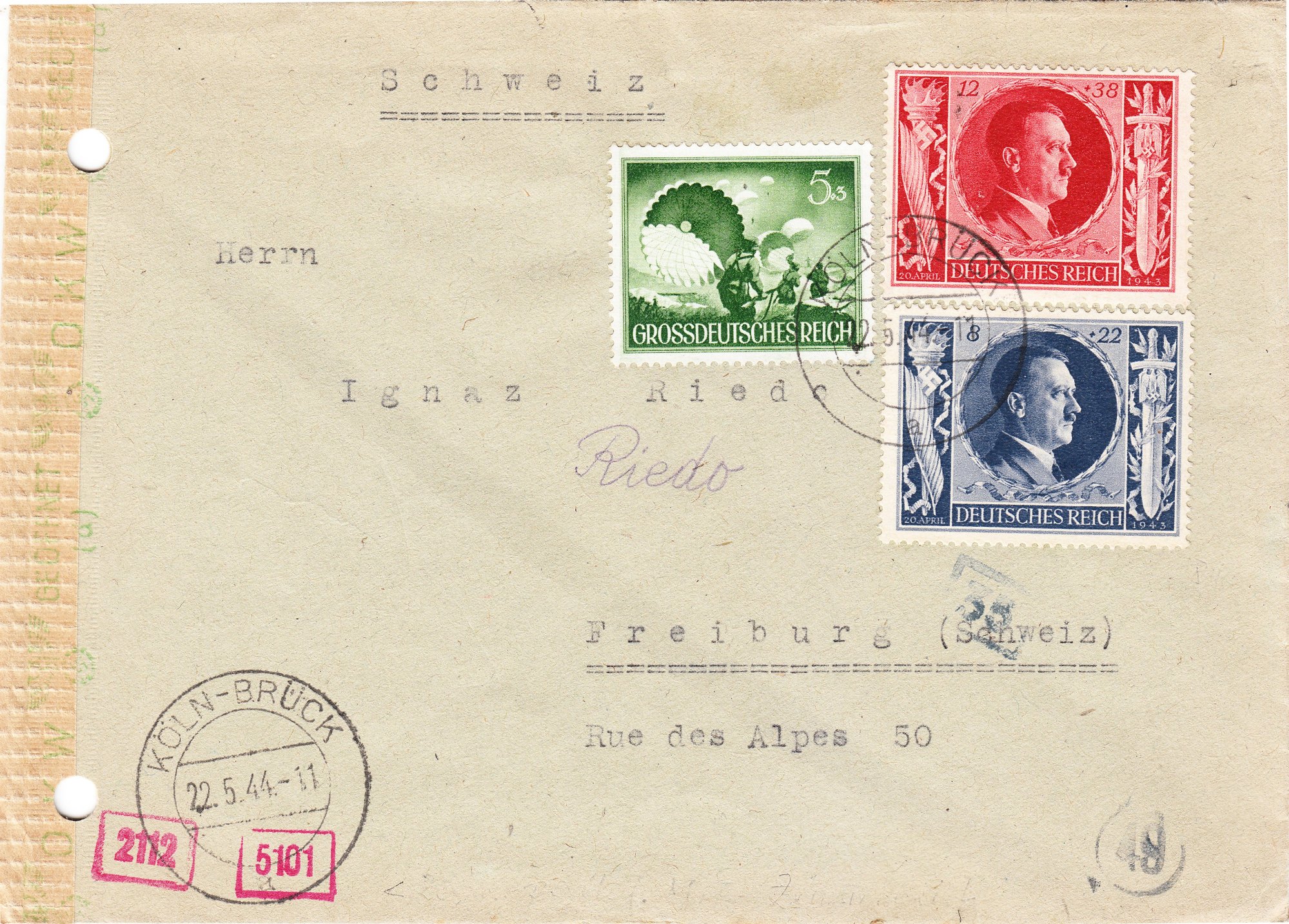 Dieser nach Freiburg in der Schweiz adressierte Brief wurde am 22.05.1944 in KÖLN-BRÜCK aufgegeben: