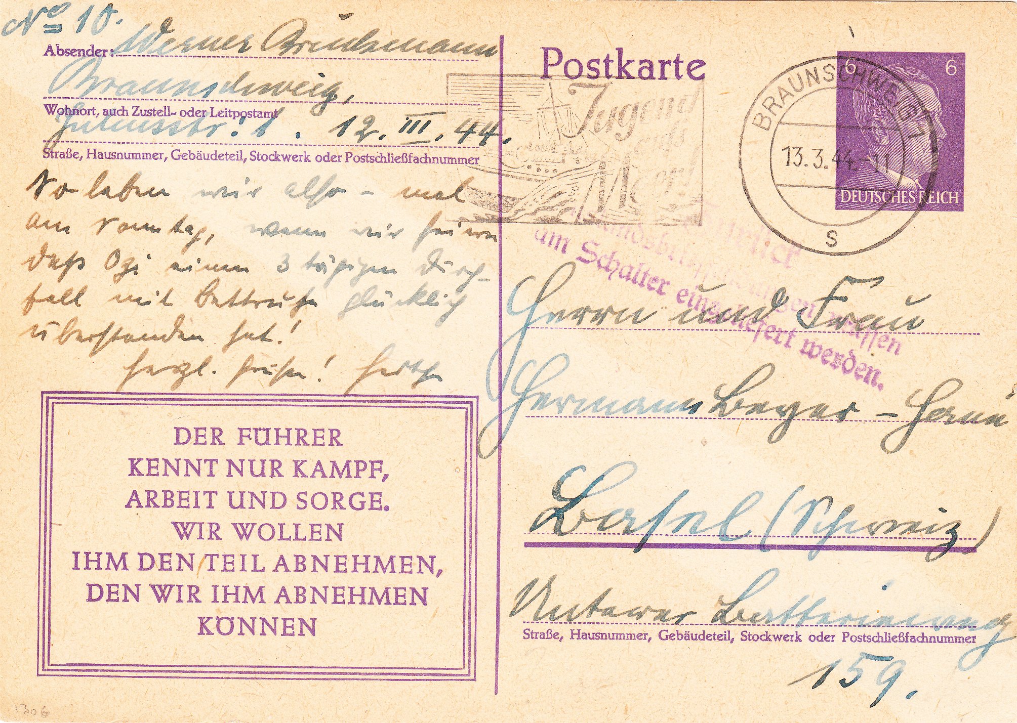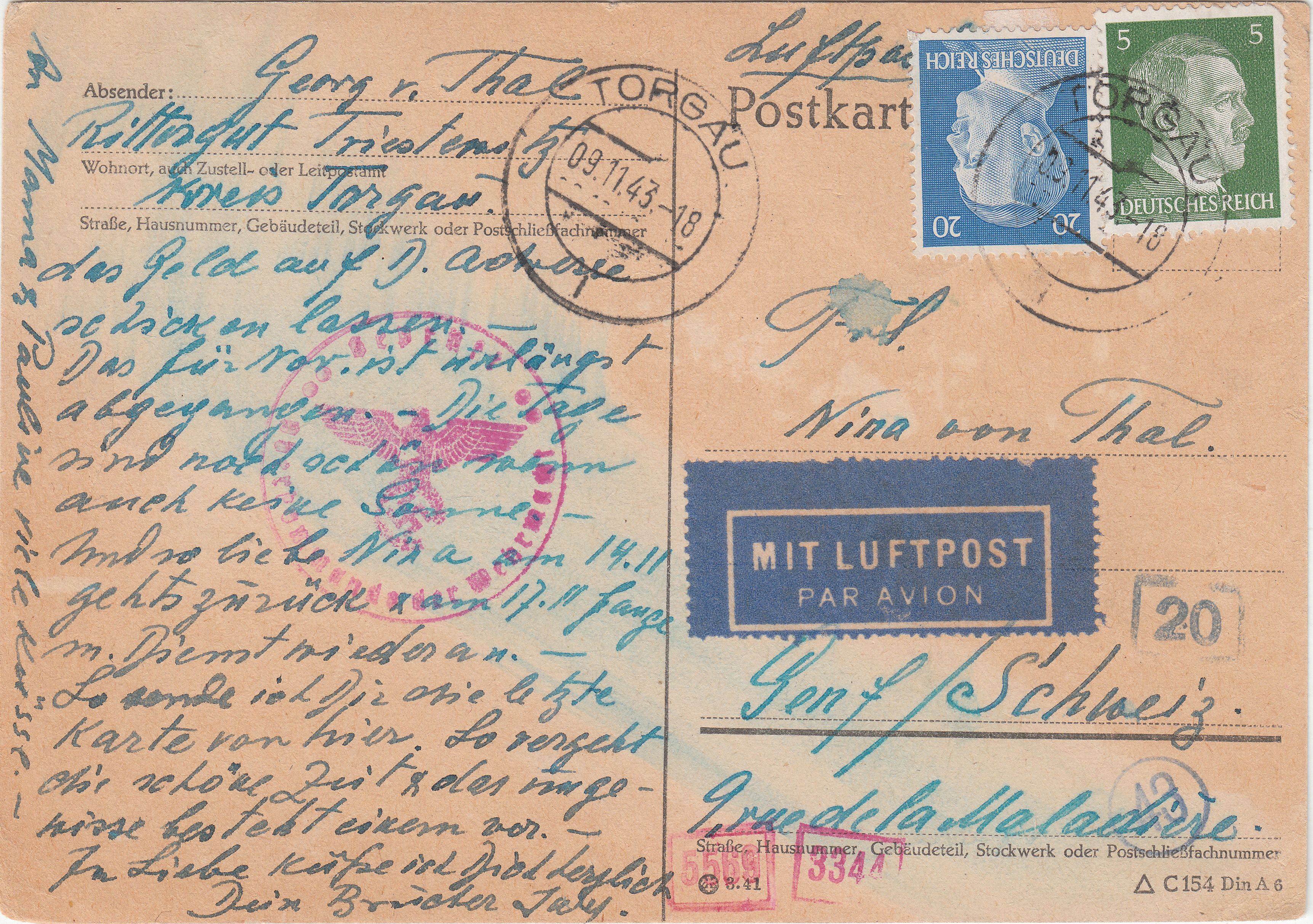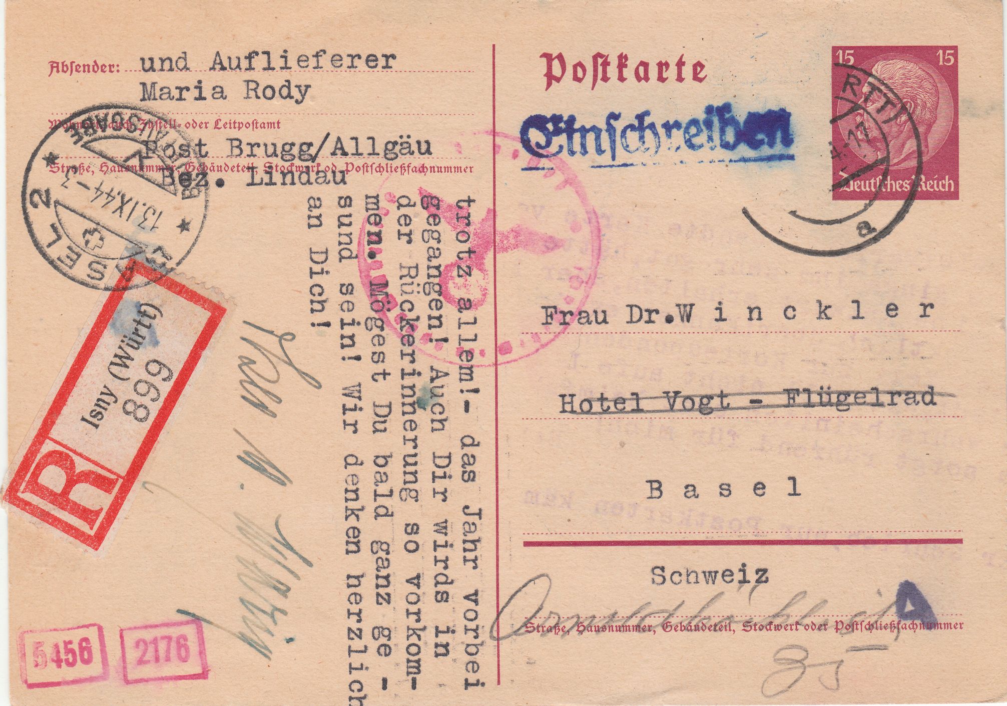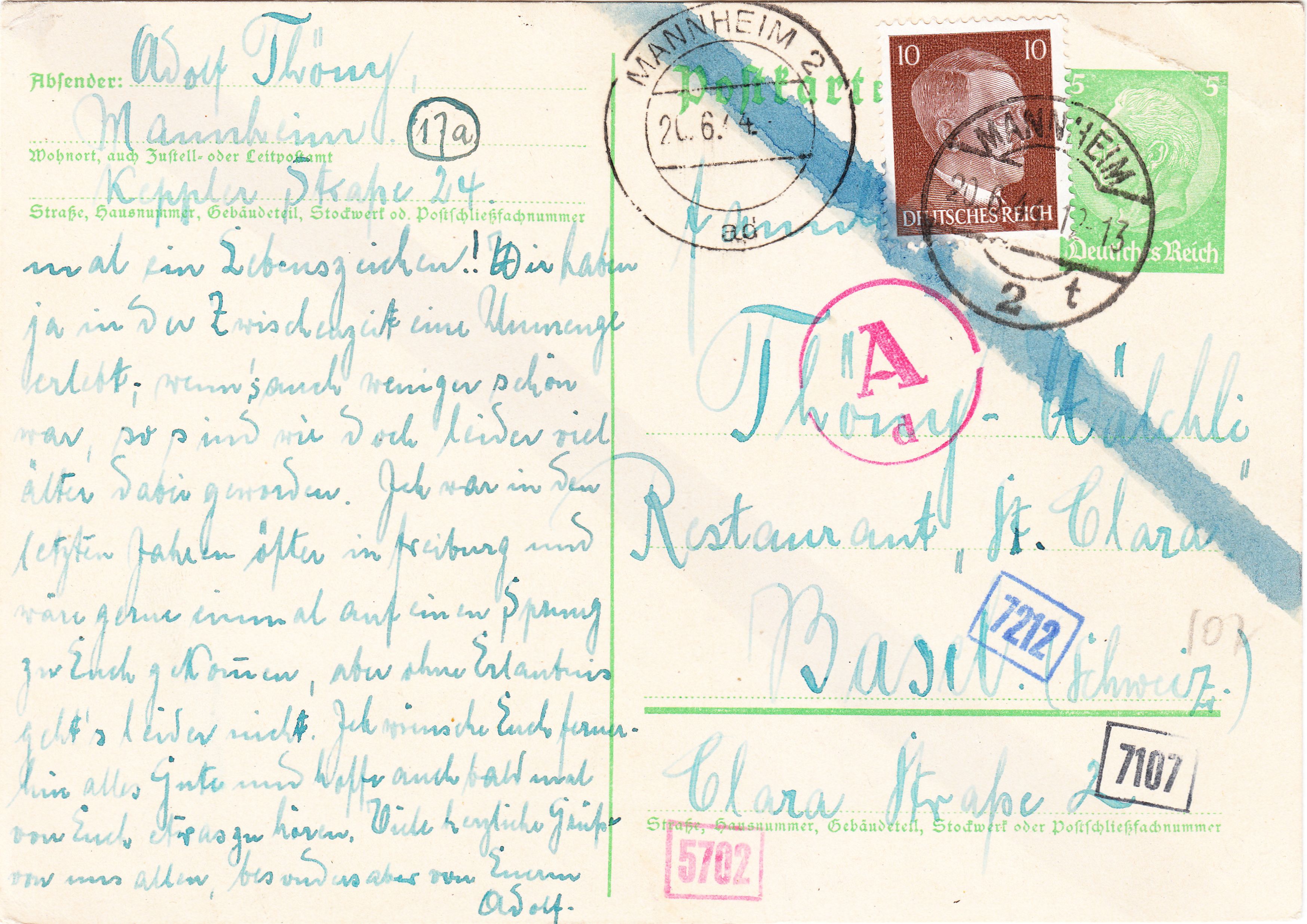 Dieser nach Freiburg in der Schweiz adressierte Brief wurde am 22.05.1944 in KÖLN-BRÜCK aufgegeben: