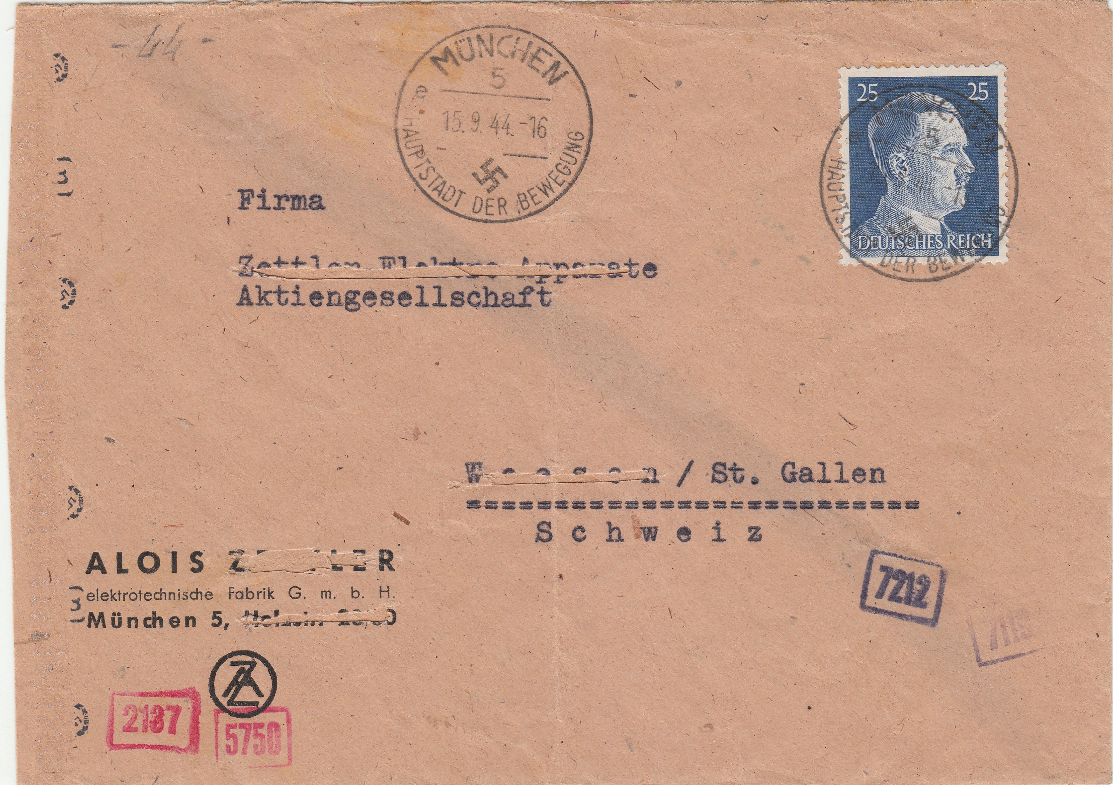 Der Brief durchlief die für Post in die Schweiz zuständige ABP München, wo er linksseitig geöffnet und nach erfolgter Prüfung mit einem senkrecht geriiffelten neutralen Verschlußstreifen der Briefverschlussvorrichtung, Landsmann DVB1.4, wieder verschlossen wurde.