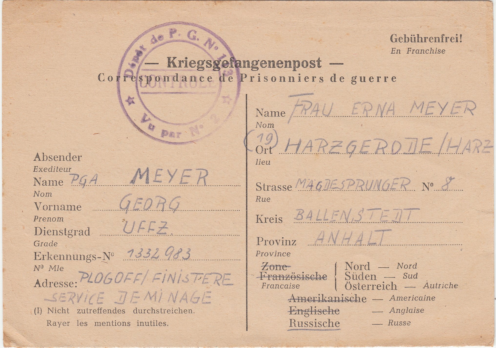 Wir erfahren aus der Absenderangabe den Dienstgrad "UFFZ." = Unteroffizier sowie als Adresse "PLOGOFF/FINISTERE SERVICE DEMINAGE". Die Kriegsgefangenen beschäftigten sich demnach mit der Räumung von Minen = Déminage.