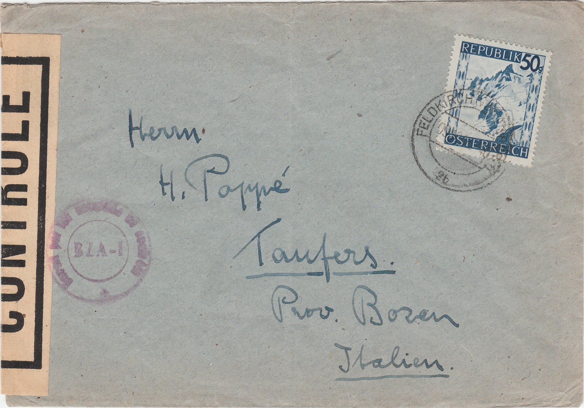 Hier ein am 09.10.1946 in FELDKIRCH (VORARLBERG) aufgegebener Brief, adressiert nach Taufers Provinz Bozen in Italien: