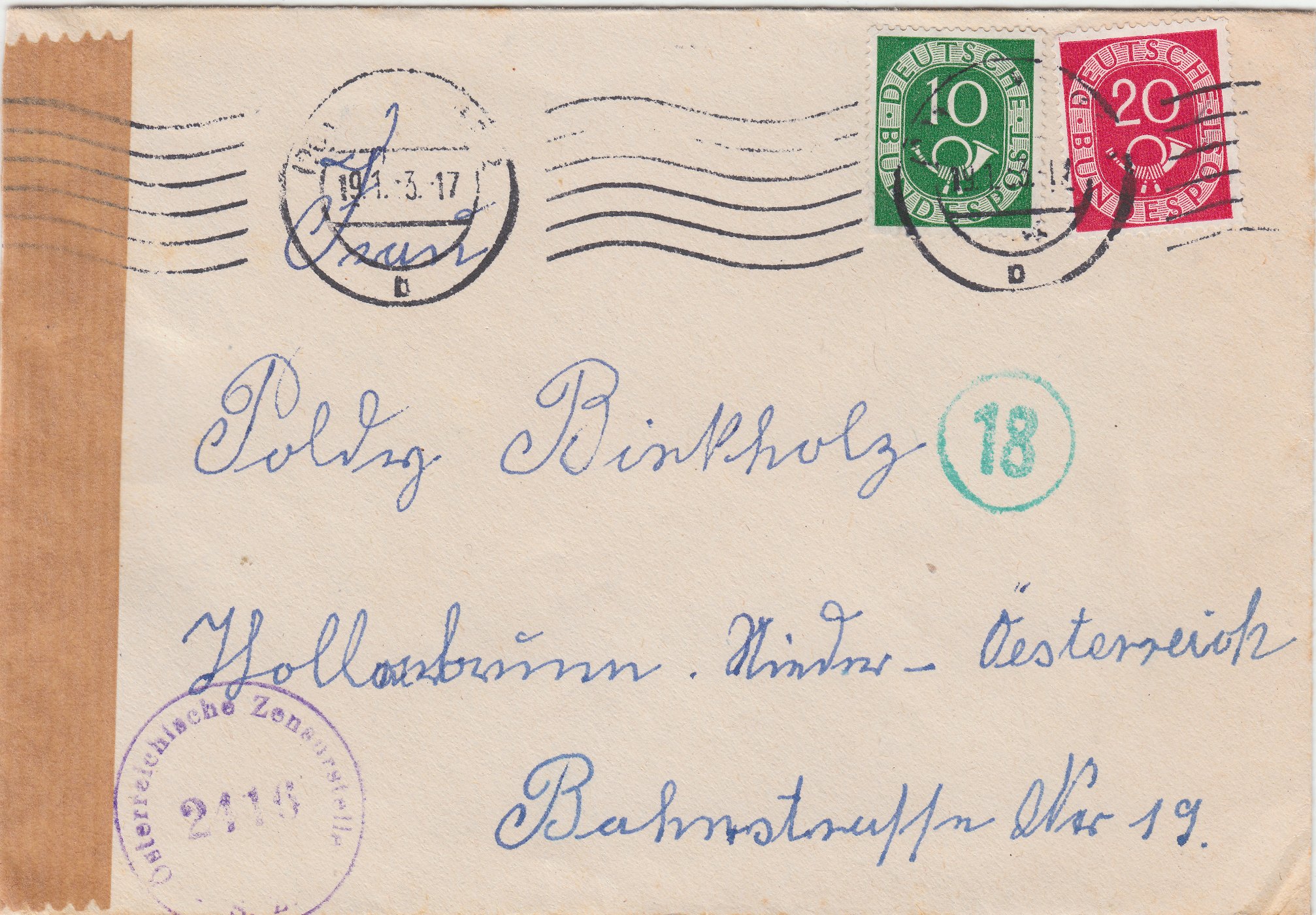Dieser Brief vom 29.09.1951 aus Münzbach in Oberösterreich in die Schweiz durchlief die Zensurstelle, wo ein Prüferstempel "Österreichische Zensurstelle - S. Z. - 2413" abgeschlagen wurde: