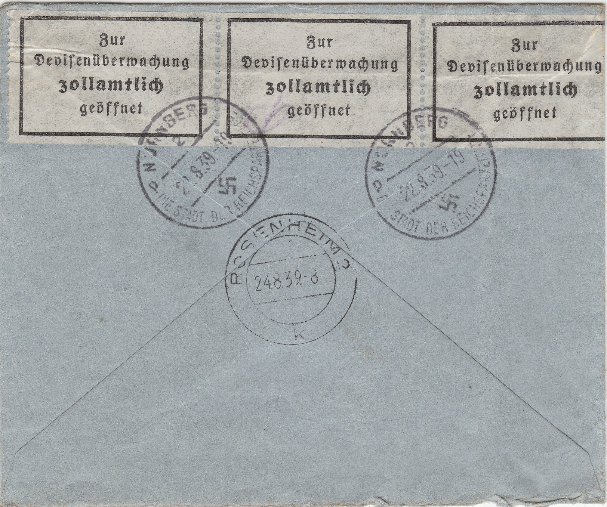 Ein weiterer Tagesstempelabdruck auf der Rückseite stammt am 24.08.1939 um 8 Uhr vom Postamt ROSENHEIM 2: