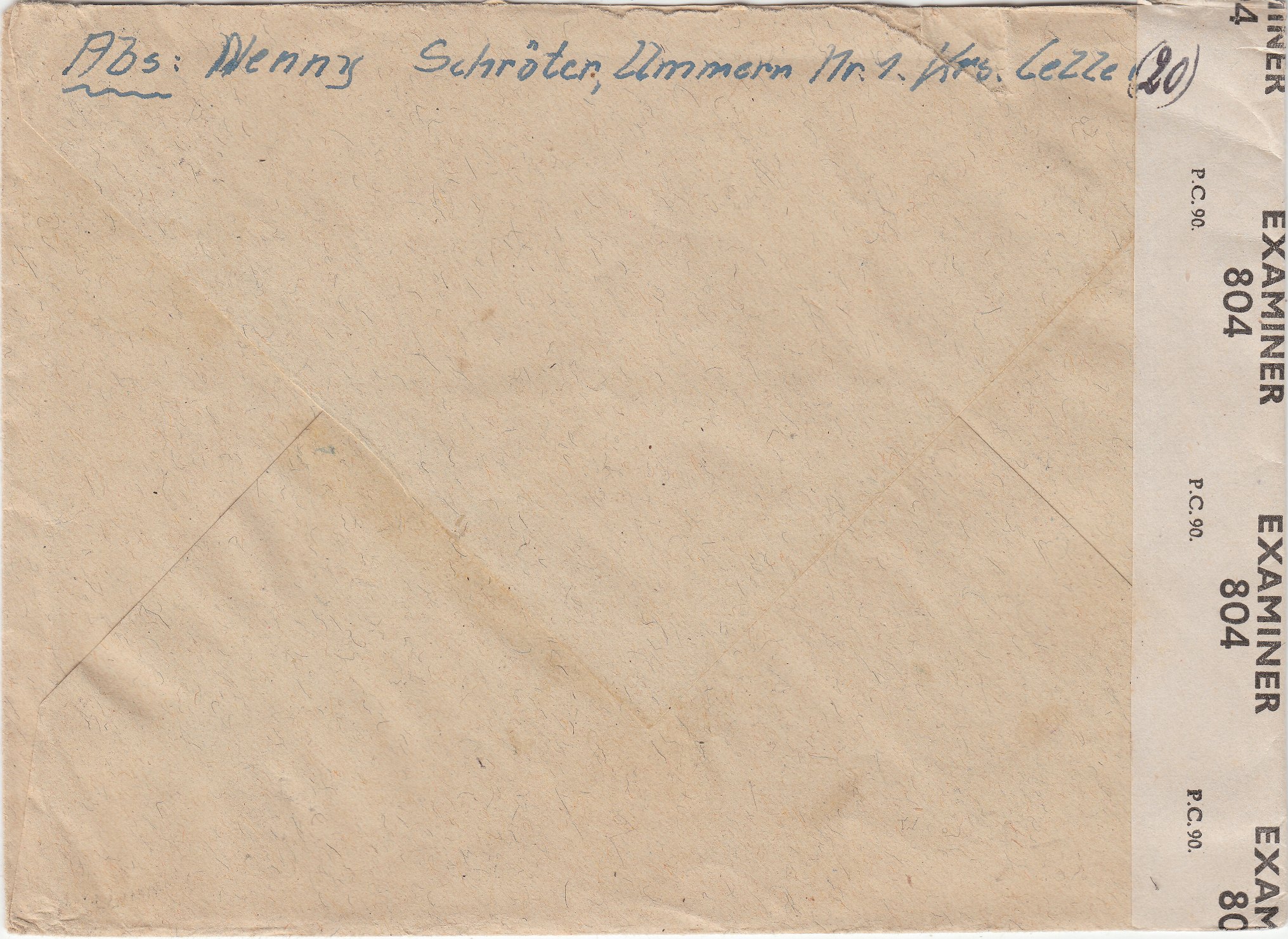 In Deutschland angekommen lief der Brief durch die britische Zensurstelle, wo er linksseitig geöffnet und mit einem Verschlußstreifen "P.C. 90 OPENED BY EXAMINER 4726" wieder verschlossen wurde, was ein vorderseitig abgeschlagener Prüfstempel "BRITISH CENSORSHIP GERMANY 3244" in Violett dokumentiert.