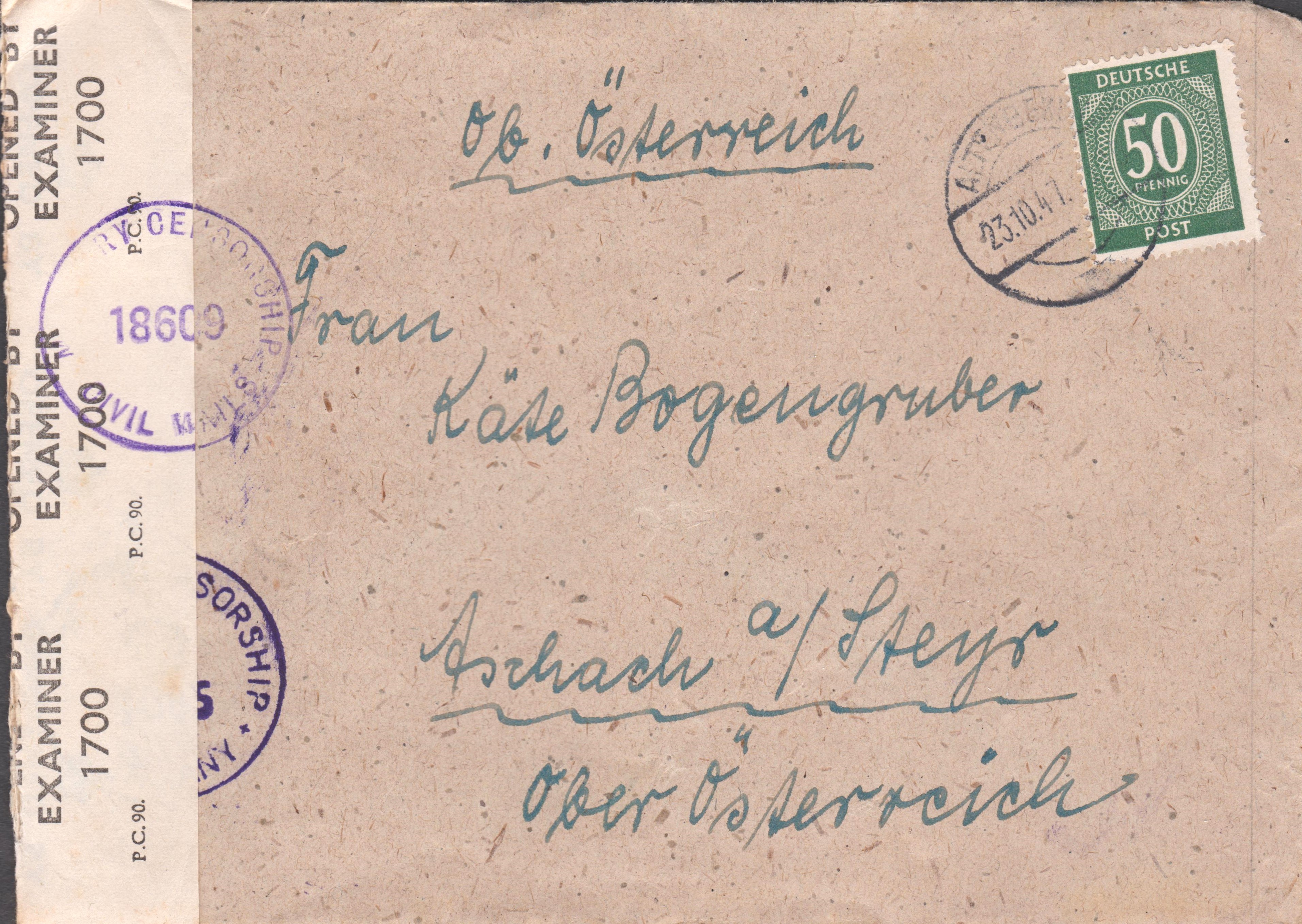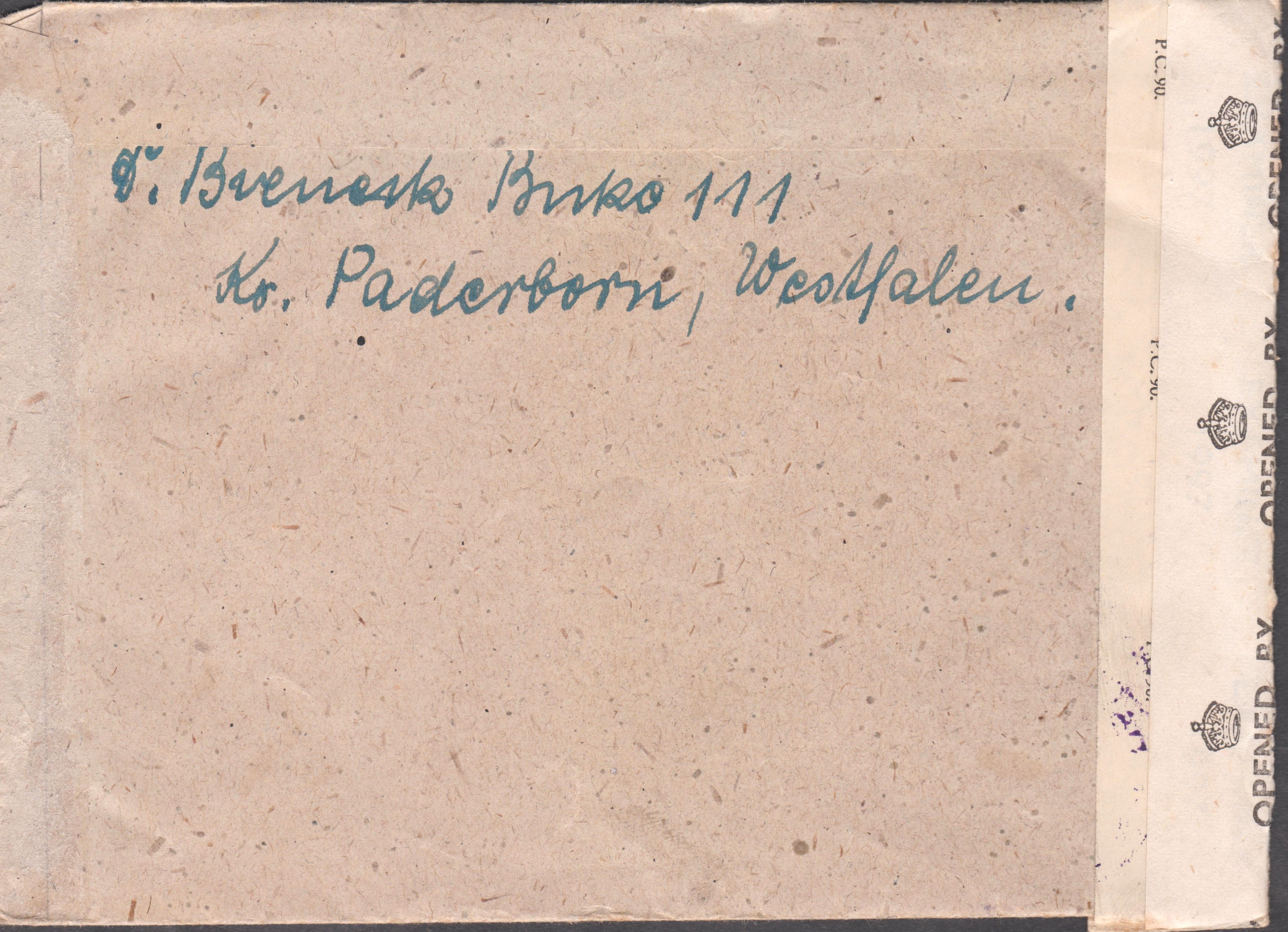 In Deutschland angekommen lief der Brief durch die britische Zensurstelle, wo er linksseitig geöffnet und mit einem Verschlußstreifen "P.C. 90 OPENED BY EXAMINER 4726" wieder verschlossen wurde, was ein vorderseitig abgeschlagener Prüfstempel "BRITISH CENSORSHIP GERMANY 3244" in Violett dokumentiert.