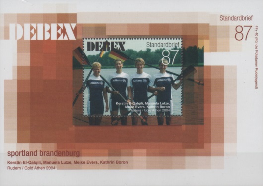 Dieser Block ist wieder ein Beispiel für moderne deutsche Privatpost. Zu sehen ist eine deutsche Frauen-Mannschaft, die im Vierer ohne in Athen Gold gewonnen hat.