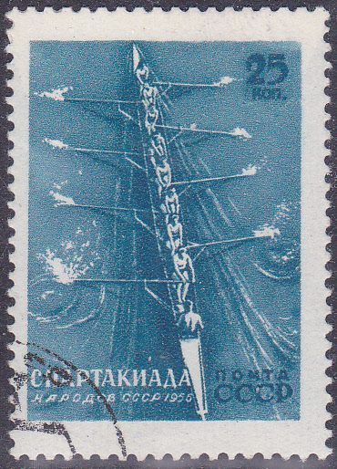 Obwohl auf dieser Marke aus der Tschechoslowakei (MiNr 1120) nur ein Ruderer in Vordergrund zu sehen ist, handelt es sich um einen Achter (wie an dem Boot im Hintergrund zu erkennen ist).