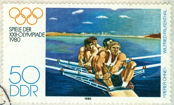 Auch die MiNr. 2505, der 50 Pfennig-Wert der DDR-Ausgabe zu den Olympischen Sommerspielen 1980 in Moskau, von vielen Sportnationen boykottiert, zeigt einen Vierer ohne.