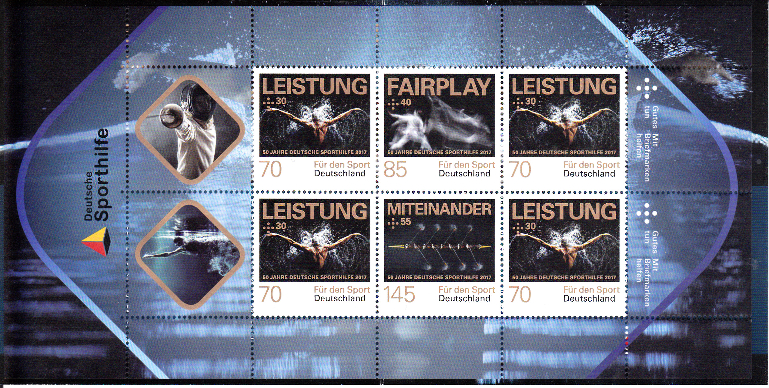 Die Marke zu 145+55 Cent der Ausgabe "50 Jahre Deutsche Sporthilfe" (MiNr 3309) zeigt einen Achter aus der Vogelperspektive. Die Darstellung soll "Miteinander" symbolisch darstellen. Hier ein Eckrandstück mit EAN-Code: