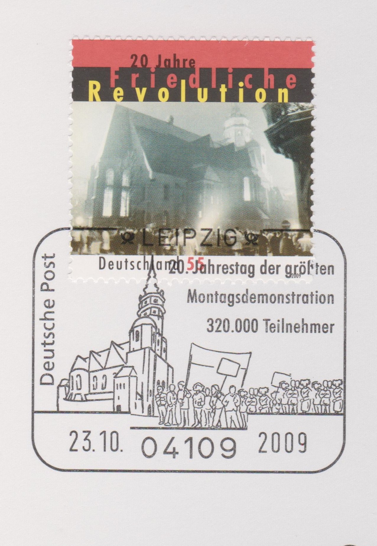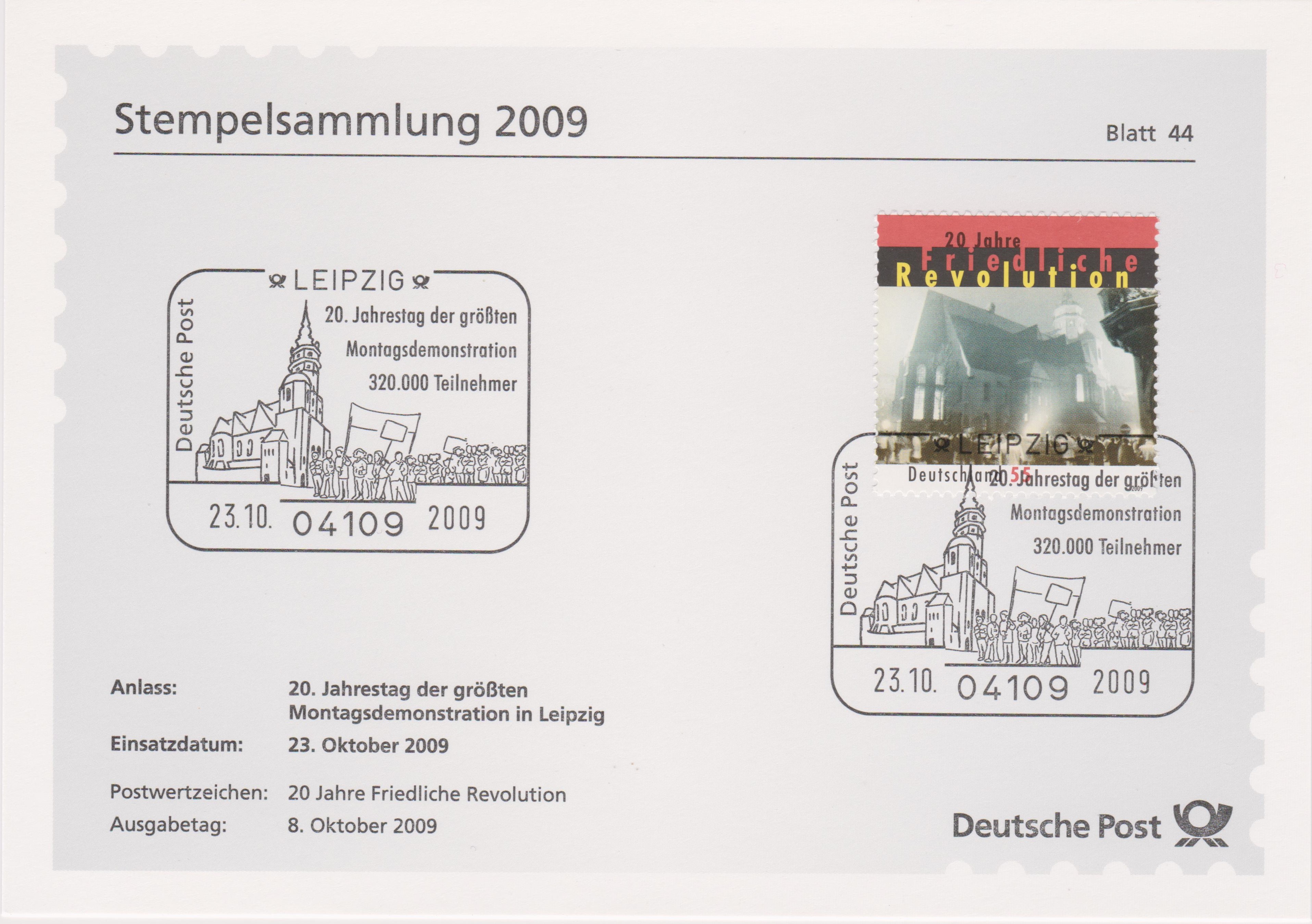 MiNr. 2762 dokumentiert den 20. Jahrestag dieses Ereignisses, hier auf Blatt 44 der Deutsche Post Stempelsammlung 2009: