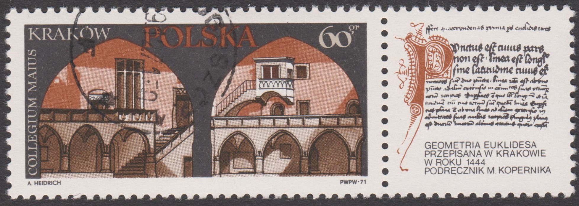 Polen MiNr. 2089 zeigt das Collegium Maius (um 1500) der Universität in Krakau sowie auf dem Zierfeld ein Handschriftenfragment von Euklid aus der "Geometrie":