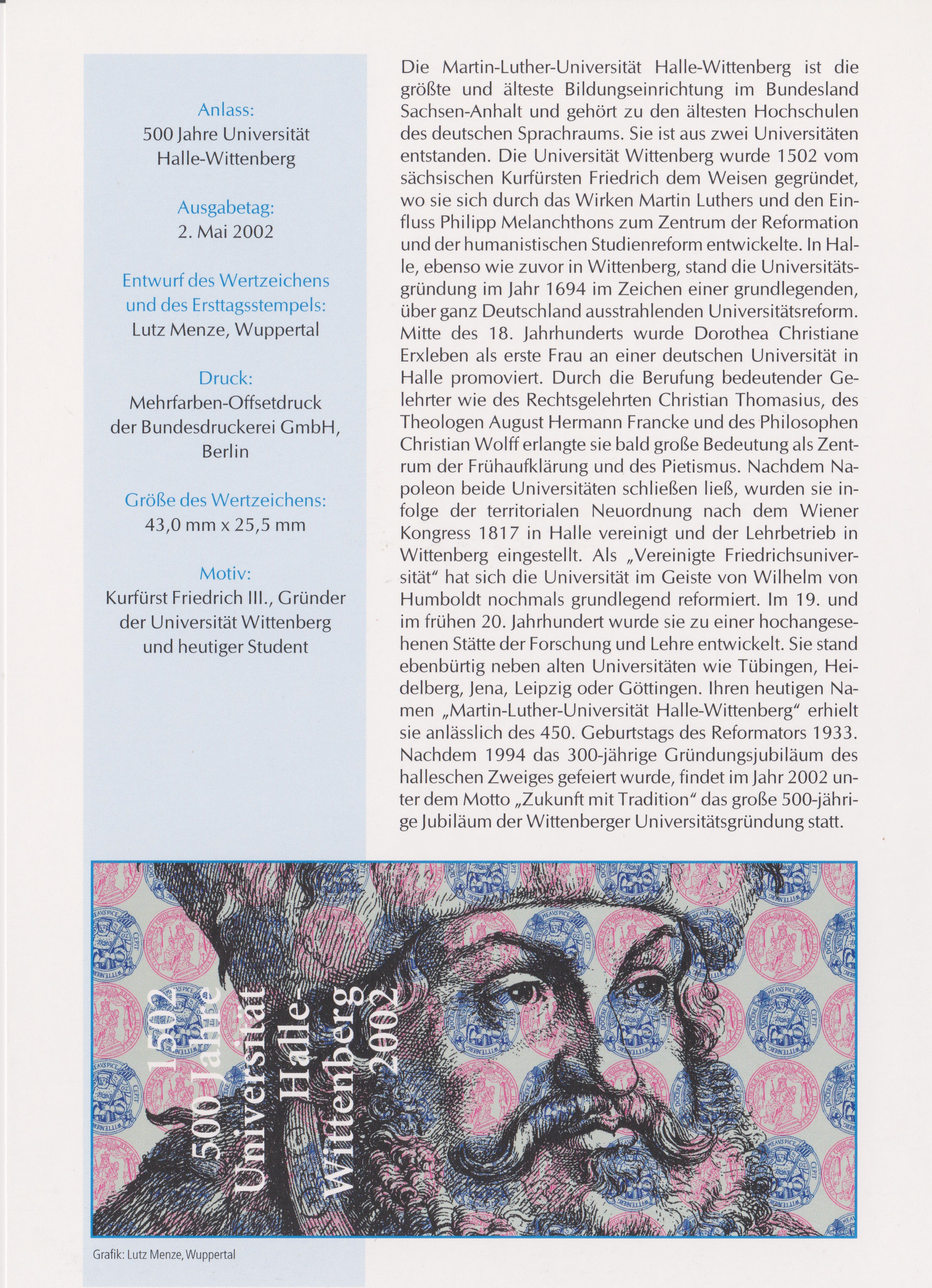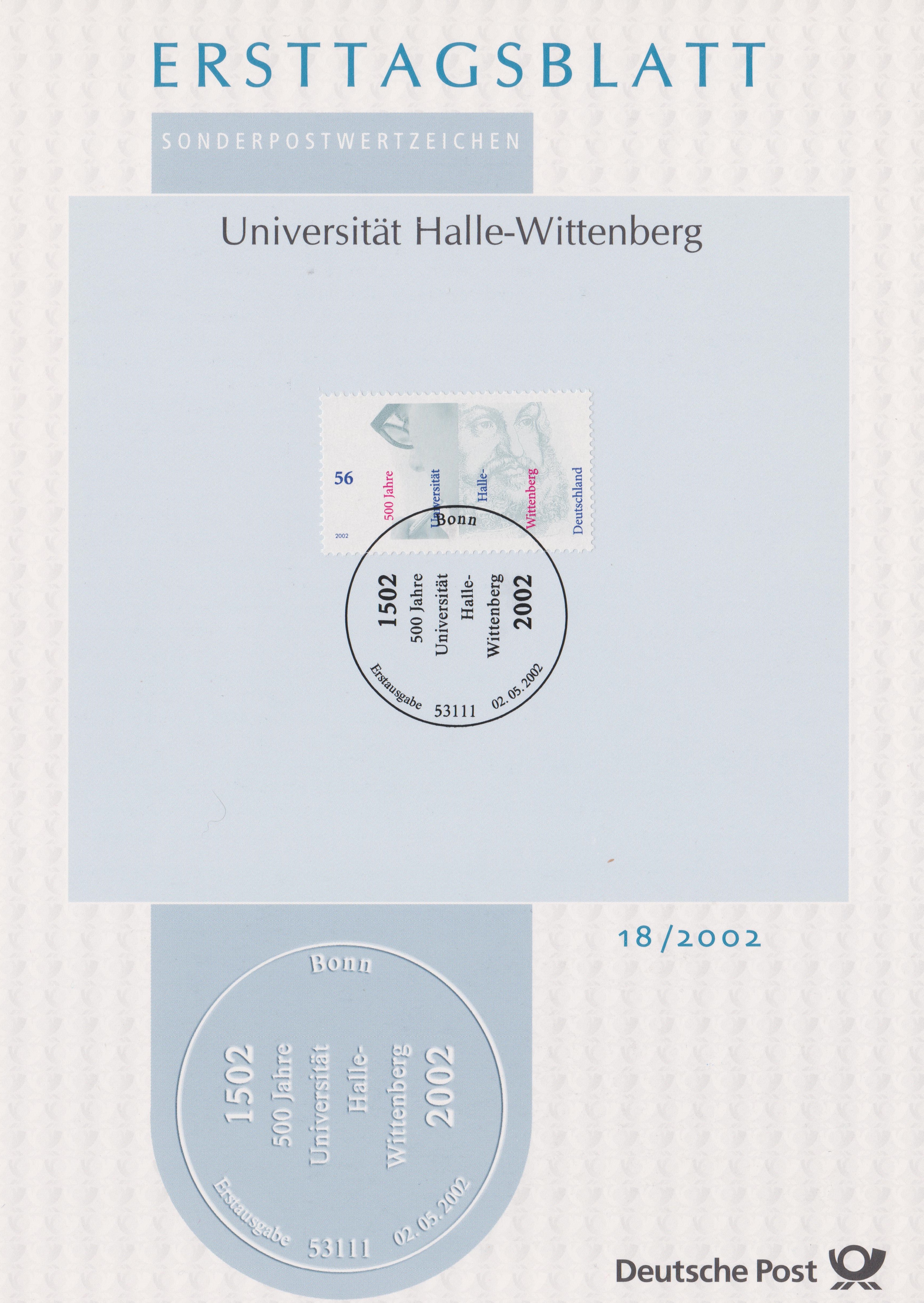 Dieses ETB 18/2002 zeigt Bund MiNr. 2254, erschienen aus Anlass "500 Jahre Universität Halle-Wittenberg":