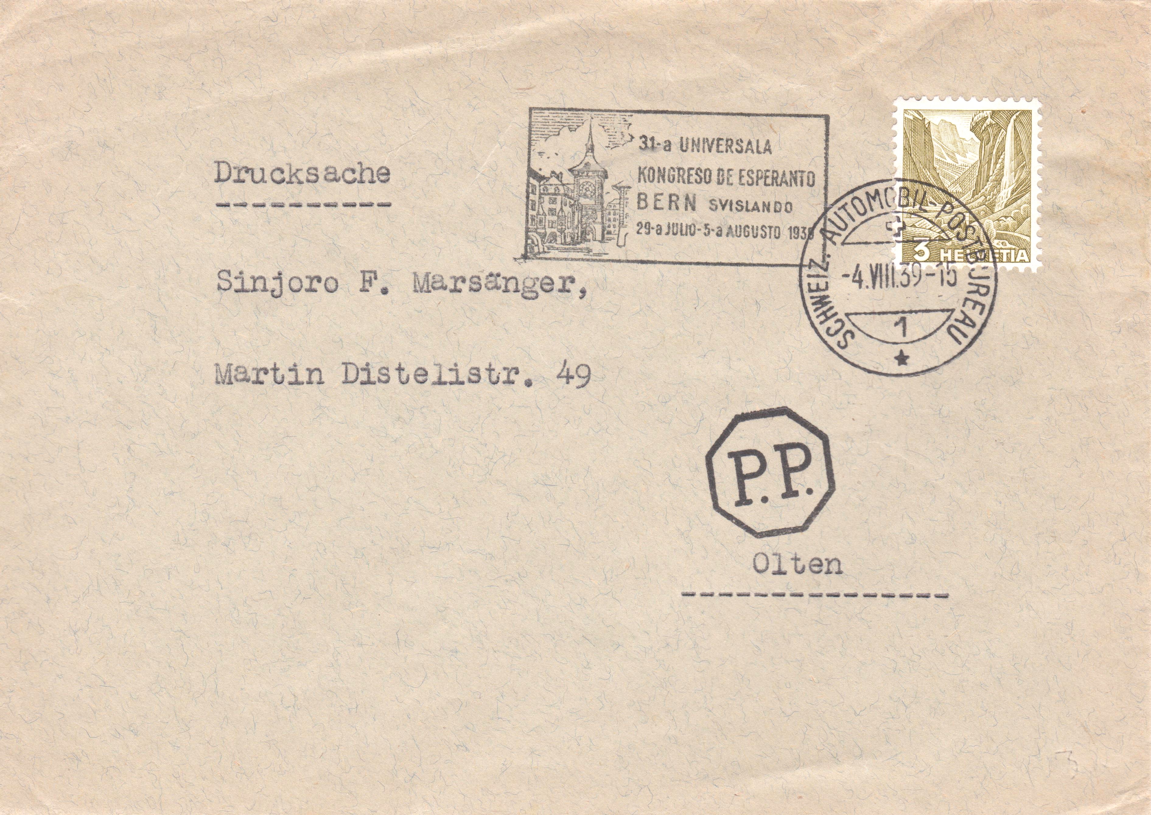 Drucksache, aufgegeben am 04.08.1939 beim SCHWEIZ. AUTOMOBIL-POSTBUREAU während des Esperantakongresses in Bern: