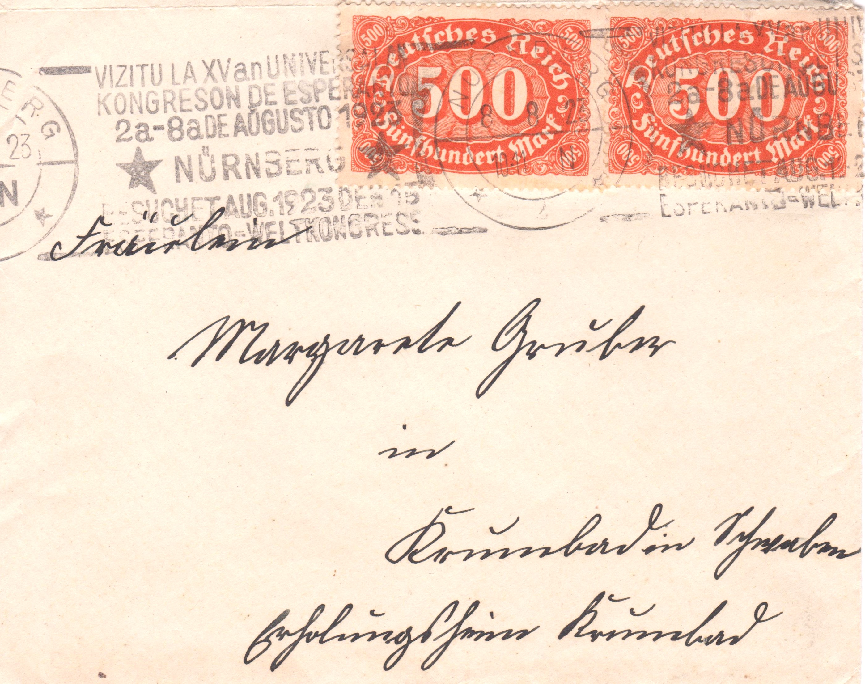 Maschinen-Bandstempel 8.8.23 mit Werbeeinsatz zum XV. Esperantoweltkongress, der vom 02.-08. August 1923 mit 4963 Teilnehmern in Nürnberg stattfand: