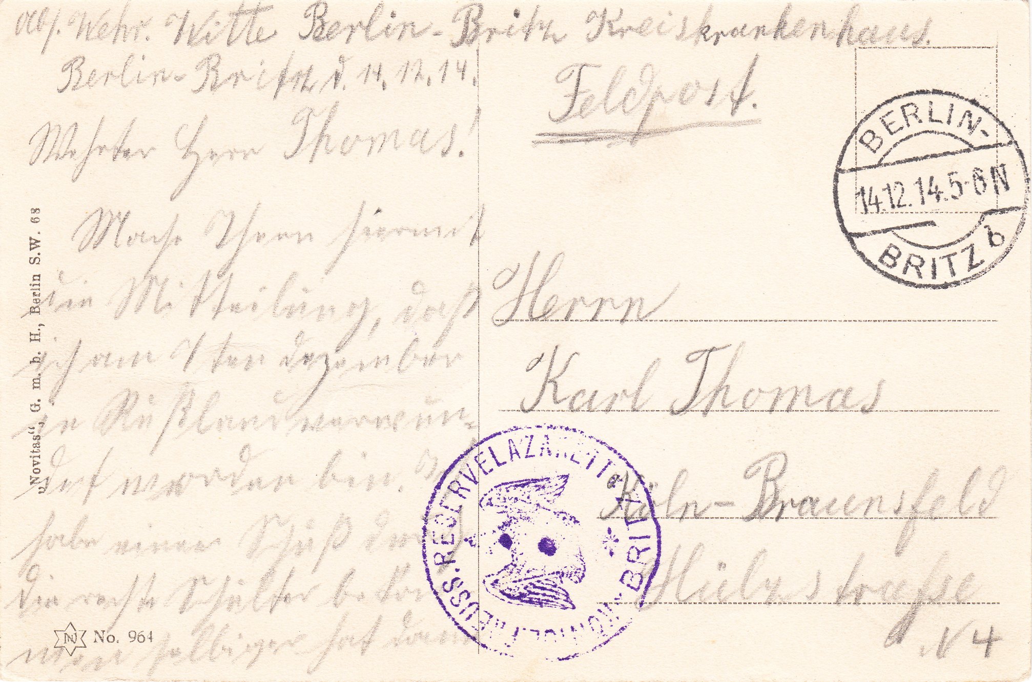 Diese am 14.12.1914 aufgegebene Ansichtskarte trägt als Absender die Angabe "Berlin-Britz Kreiskrankenhaus".