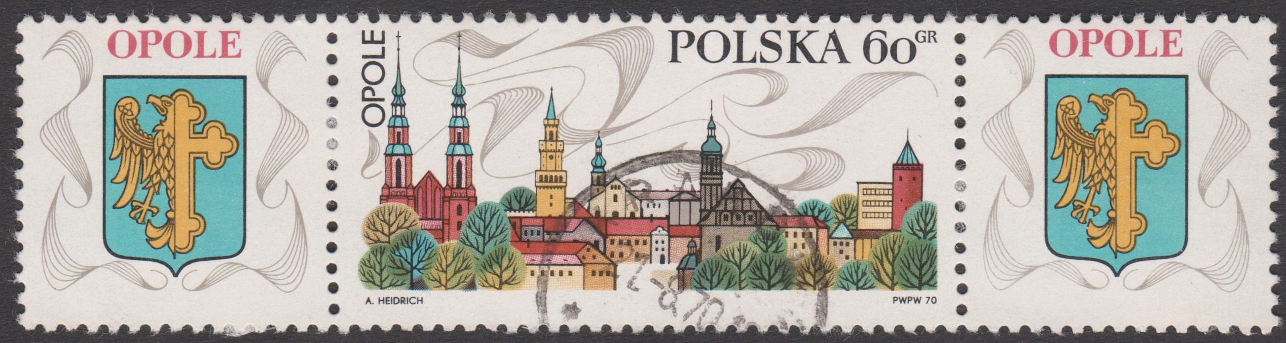 Polen MiNr. 2002 zeigt eine Stadtansicht von Oppeln und das Zierfeld zeigt das Stadtwappen von Oppeln: