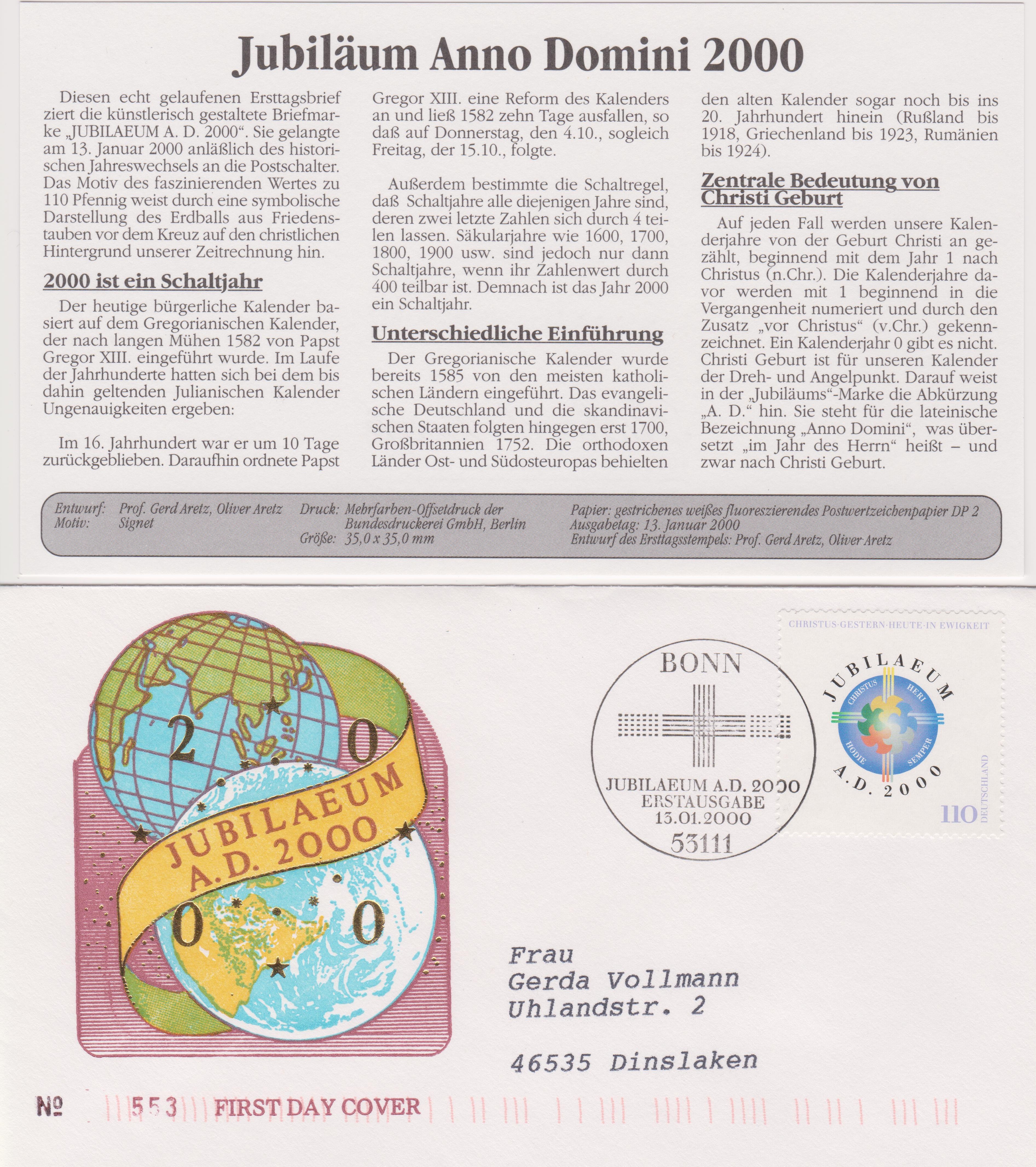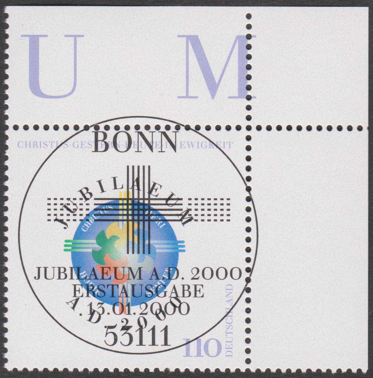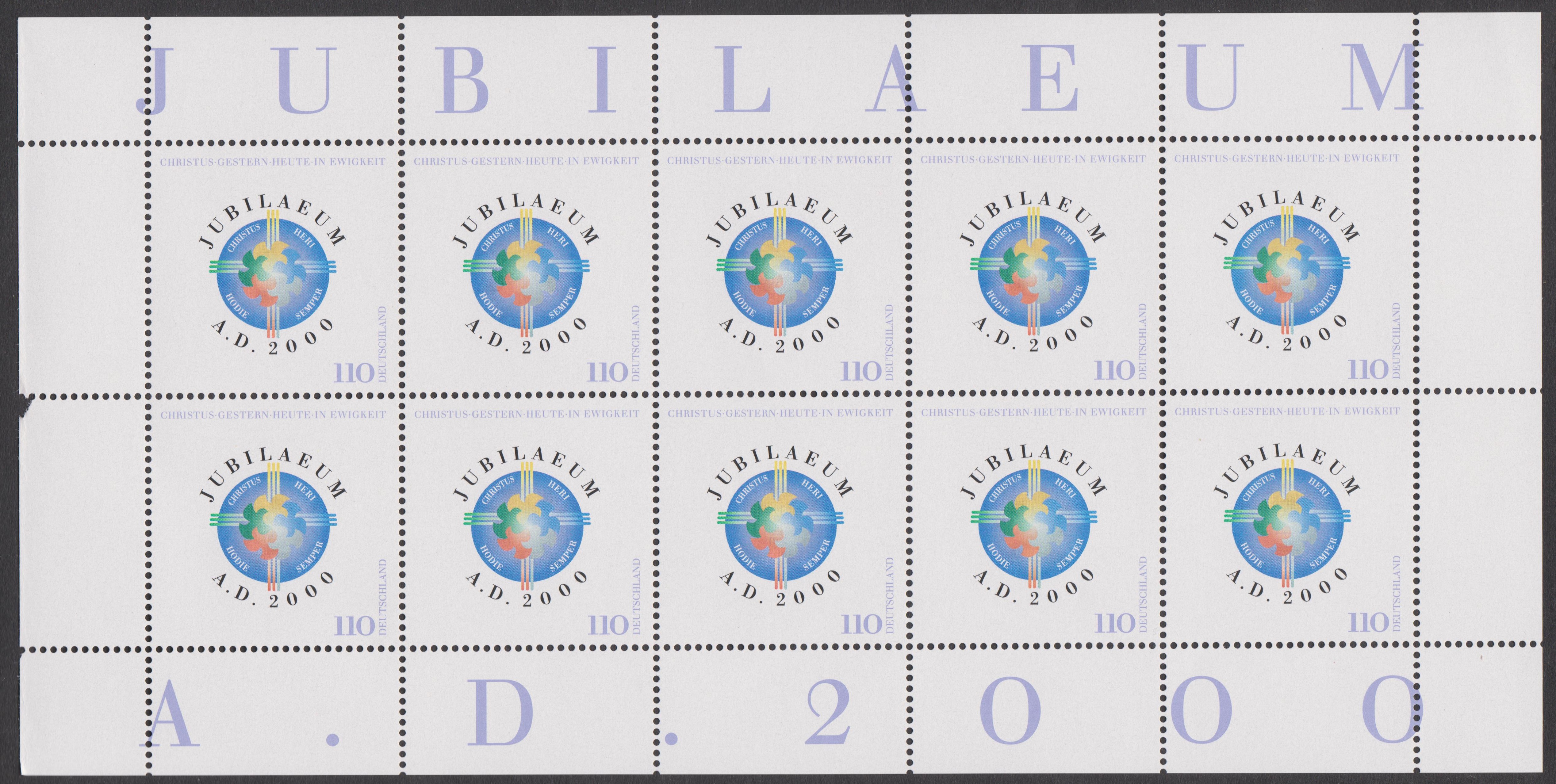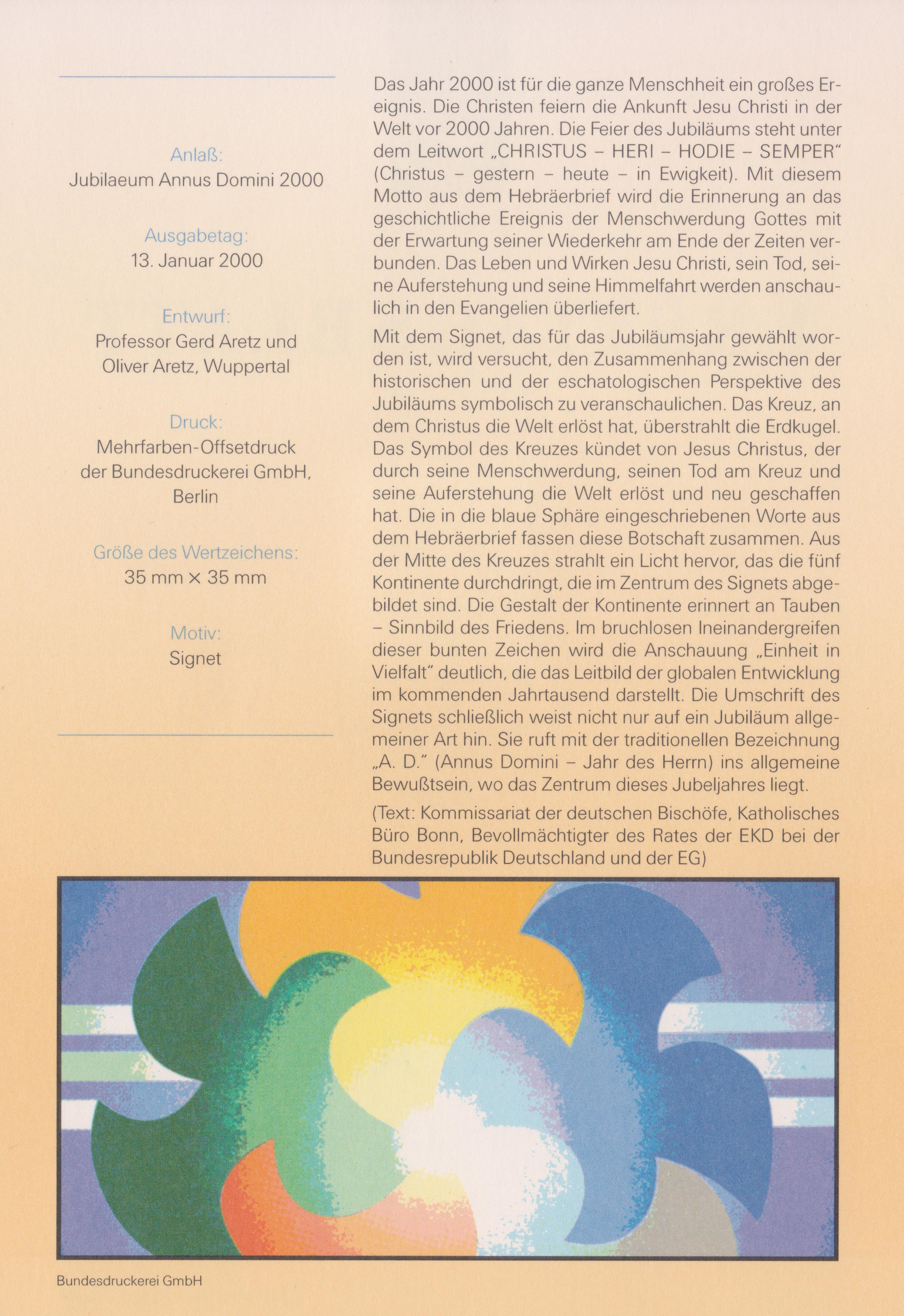 "JUBILAEUM A. D. 2000" lautet das Motto dieses Ersttagsblattes 1/2000 mit Bund MiNr. 2087: