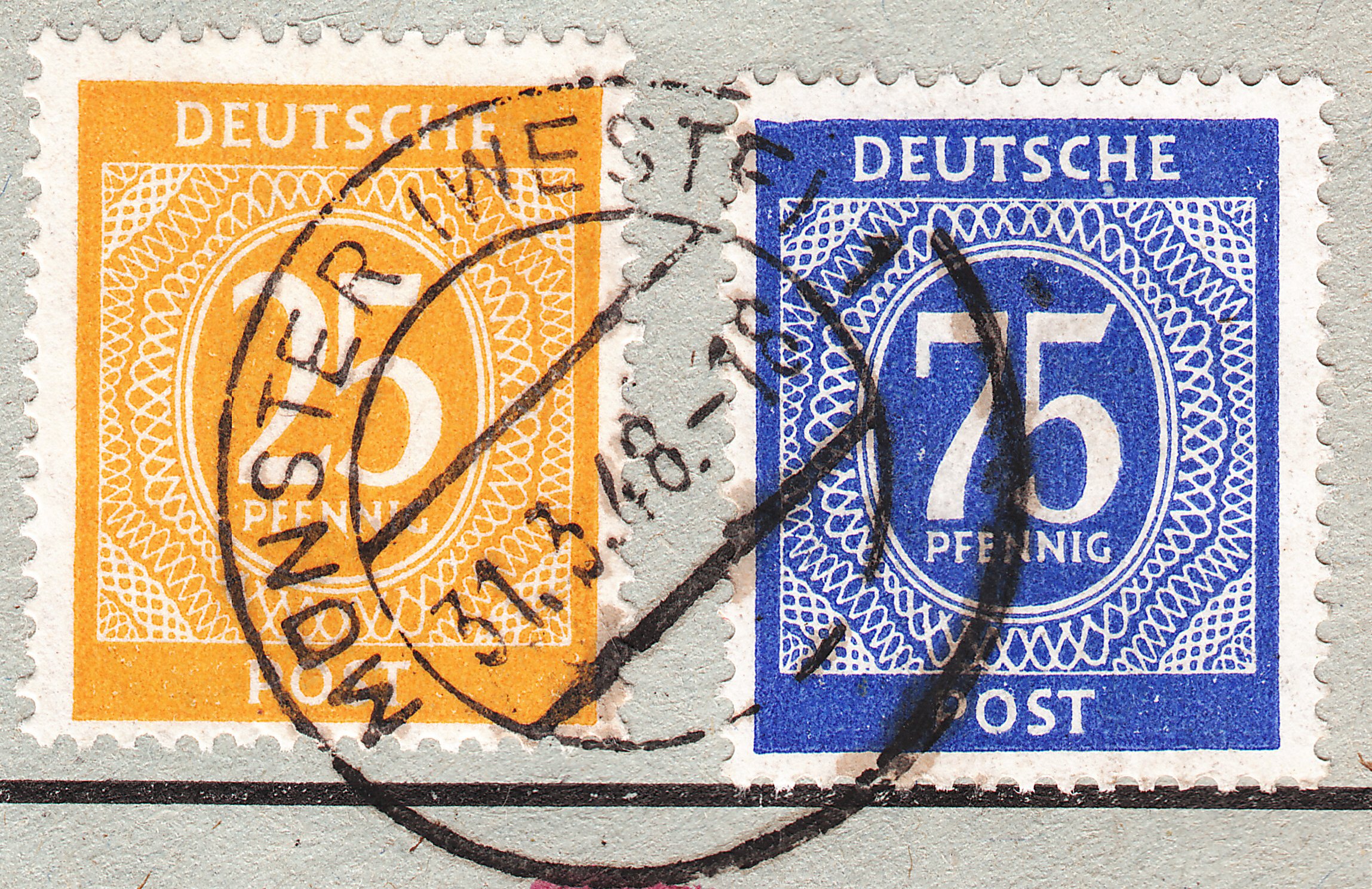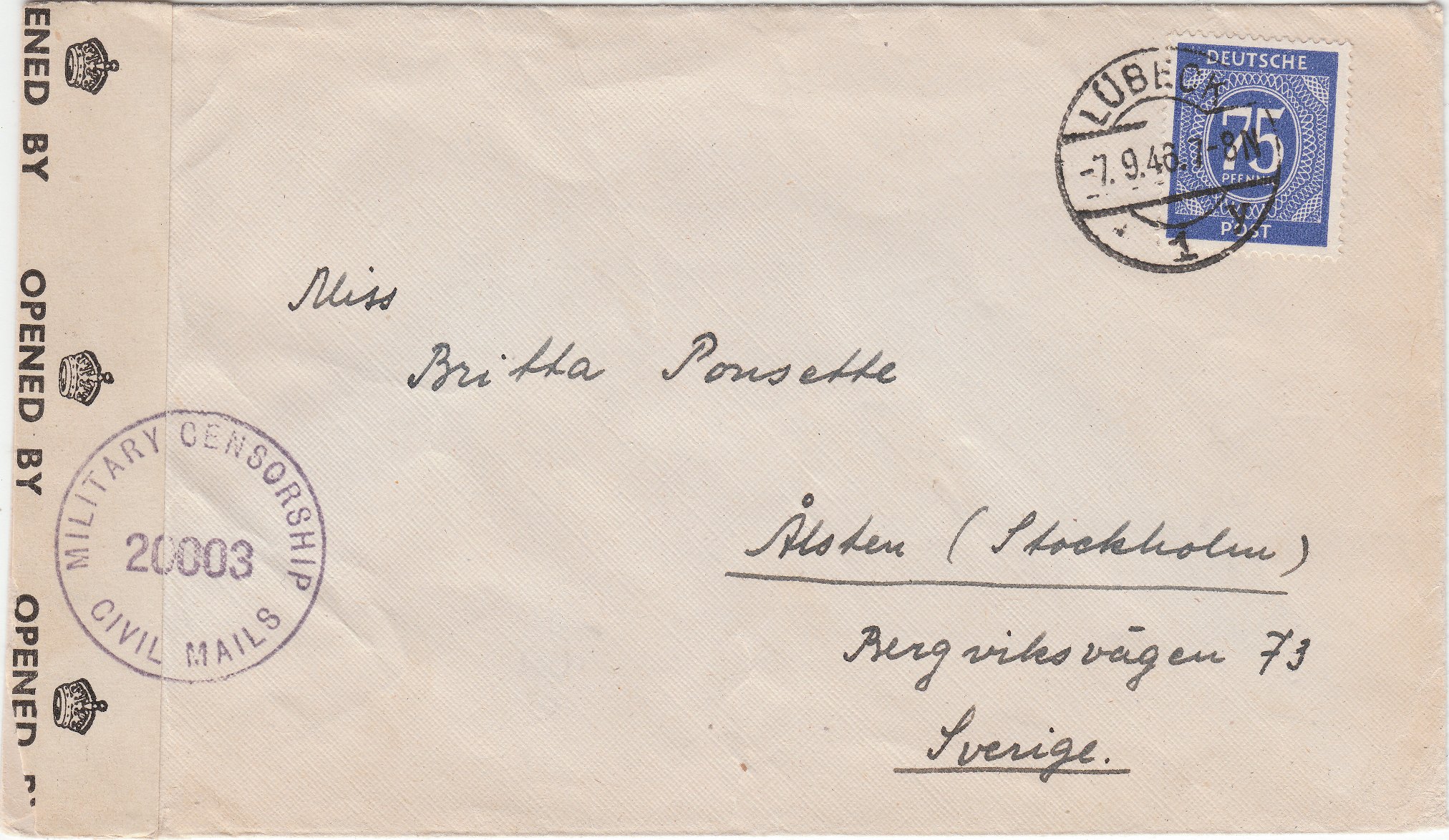 Der 75 Pf Wert der Ziffernserie deckte vom 01.04.1946 bis zum 14.09.1947 als EF die Portostufe für Briefe ins Ausland ab. Hier ein solcher Beleg ab Lübeck nach Schweden, aufgegeben am 07.09.1946 in Lübeck: