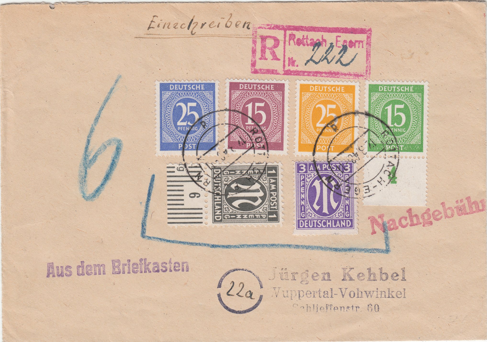 Die Frankatur wurde am 12.03.1948 in Rottach-Egern, das am Tegernsee liegt, per Tagesstempel entwertet.