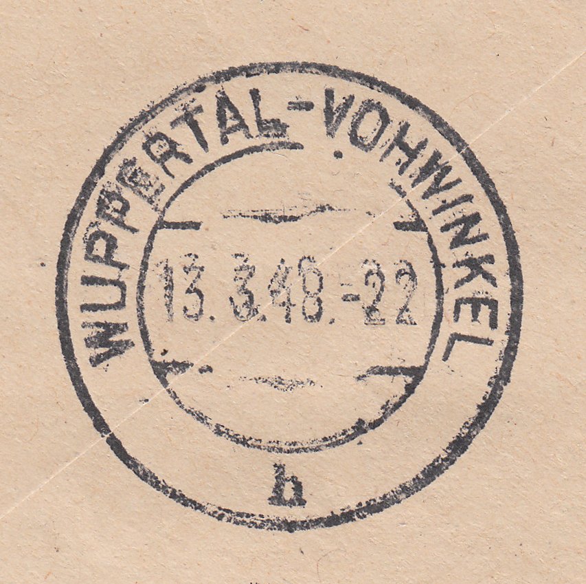 Rückseitig findet sich ein Ankunftstempel aus Wuppertal-Vohwinkel vom 13.03.1948: