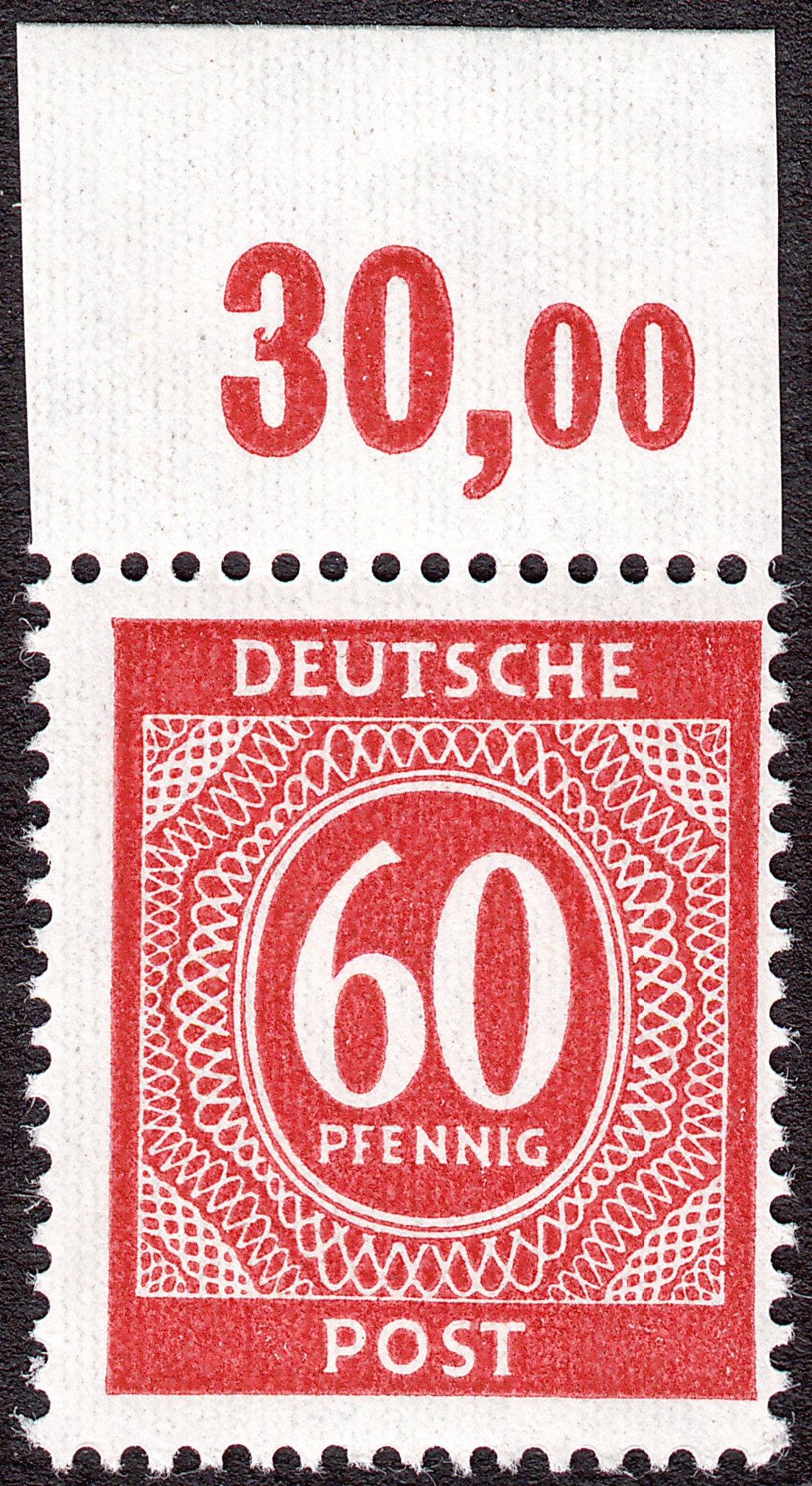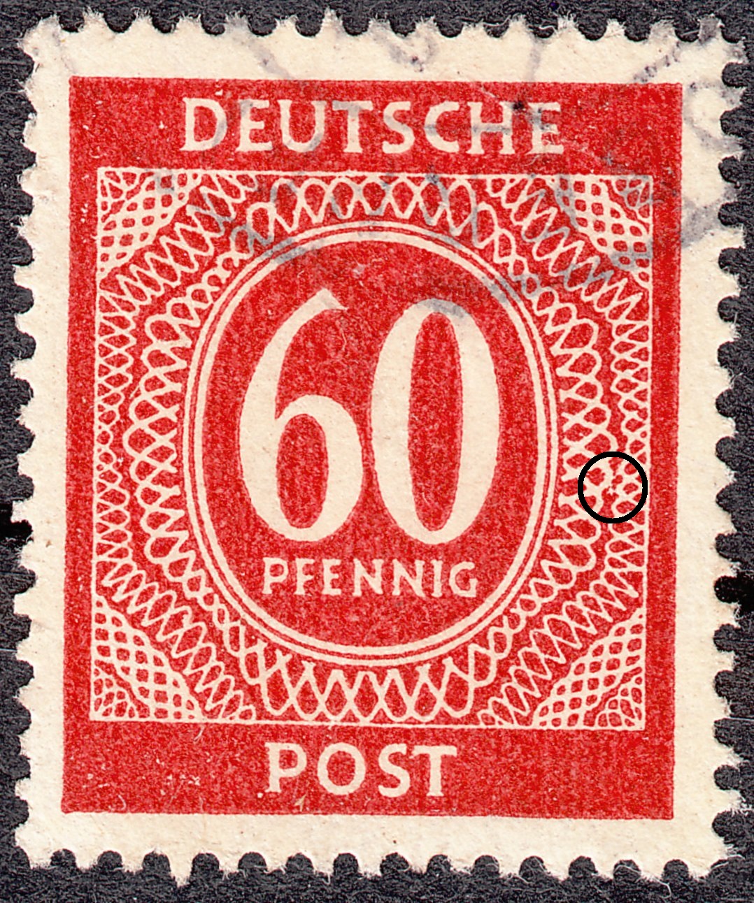 Der 60 Pf Wert der Ziffernserie zeigt bei mehreren Teilauflagen in der Reihenwertzahl im Oberrand von Feld 5 den Plattenfehler "Mittelstrich der 3 ausgebrochen":