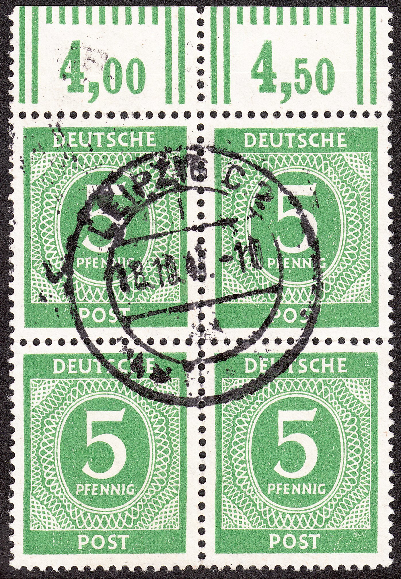 Viererblock der MiNr. 915 vom Oberrand mit Walzenstrichen, also MiNr. 915 b W OR, mit Tagesstempel LEIPZIG C 2 vom 18.10.1947: