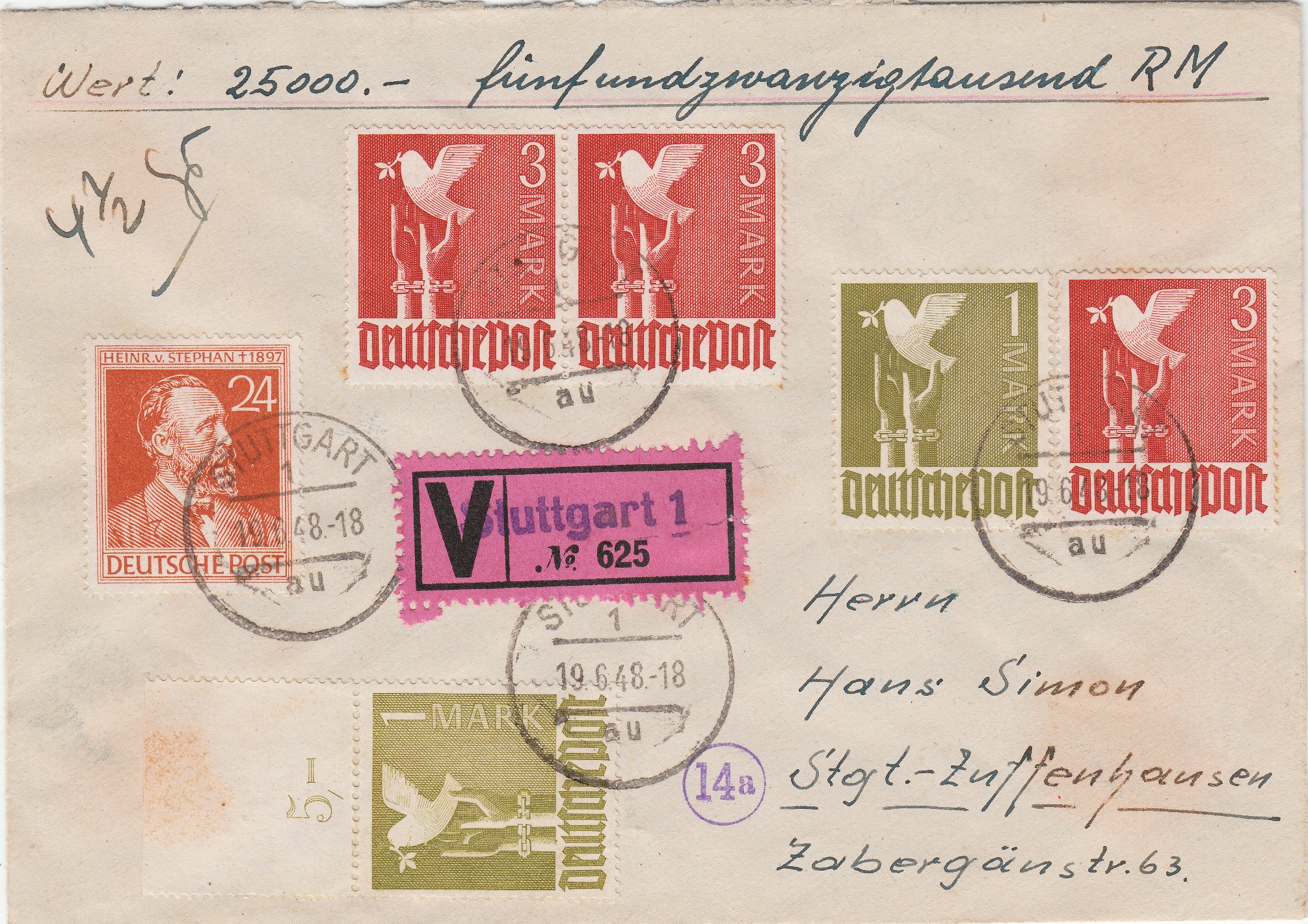 Dieser Wertbrief wurde am 19.06.1948 aufgegeben, also kurz vor der am 21.06.1948 erfolgenden Abwertung der Gemeinschaftsausgaben auf ein Zehntel des Nennwertes.