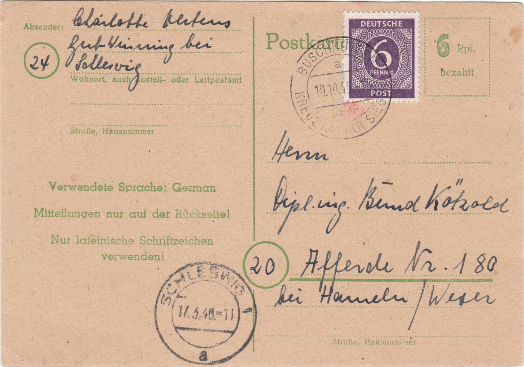 Die Postkarte wurde nicht, wie eigentlich üblich, kurz nach dem Erwerb am Orte des Erwerbs, hier also Schleswig, gebraucht, sondern laut Tagesstempel auf der Frankatur erst am 10.10.1946 ab BUSCHHÜTTEN im Kreis Siegen. Es handelt sich laut dem handschriftlichen Text auf der Rückseite um eine