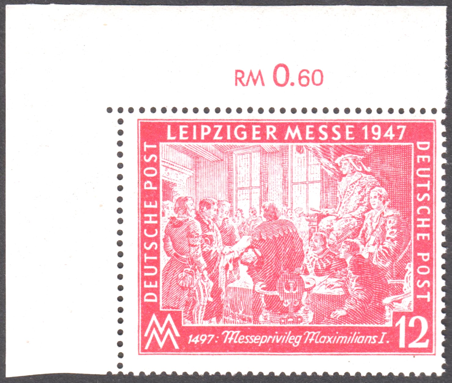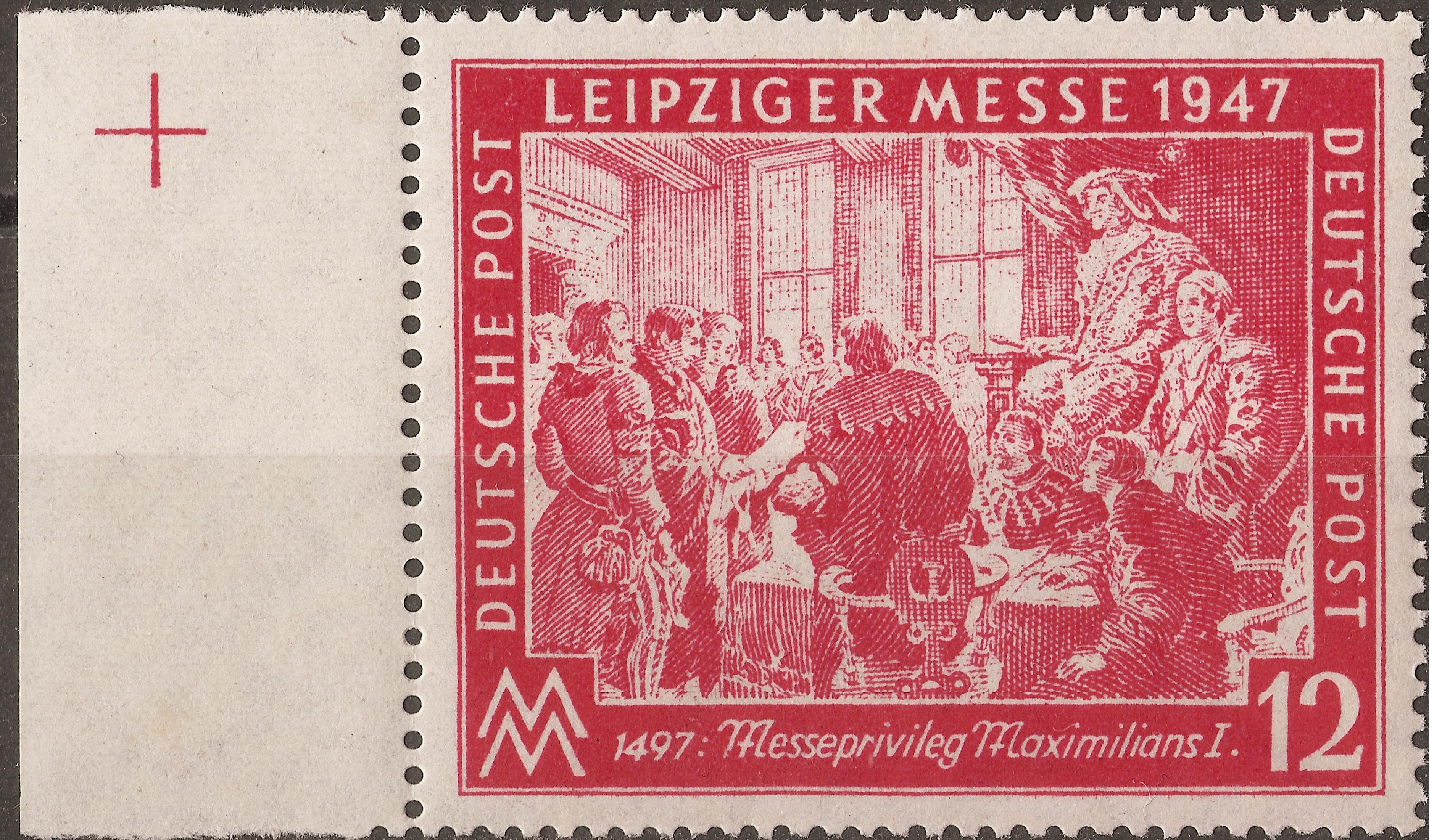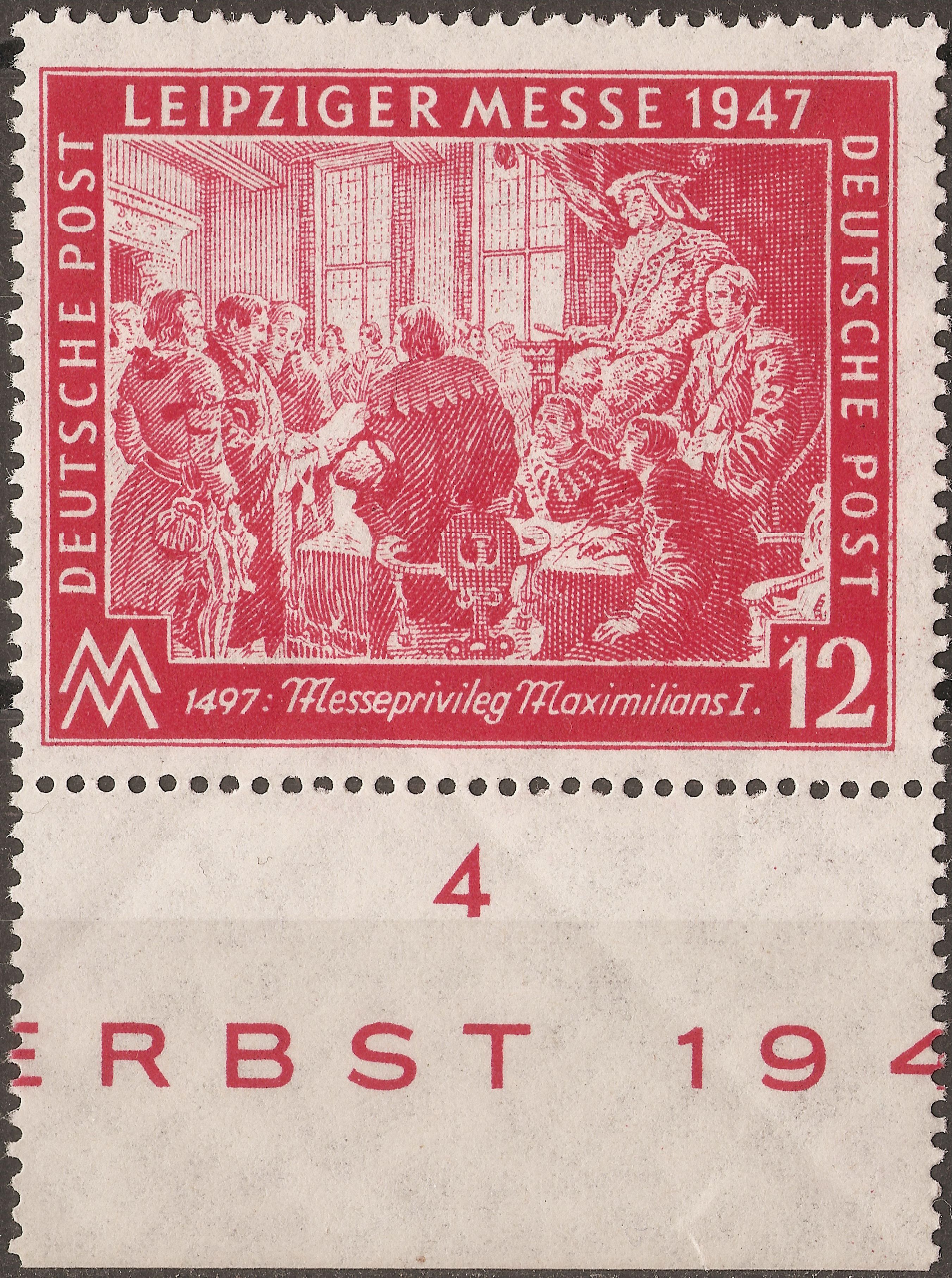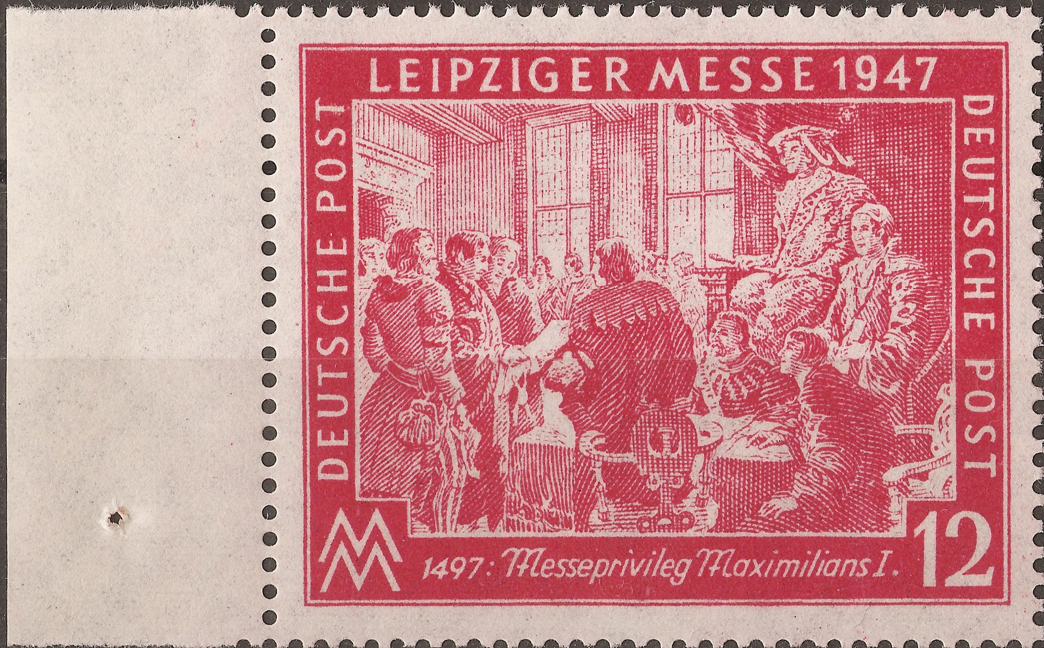 Postfrische Einzelmarke mit Michel-Plattenfehler IX: roter Punkt im ersten Abstrich des "M" von "Messeprivileg" (Feld 16).