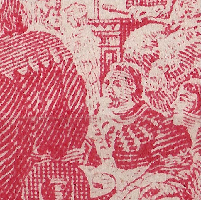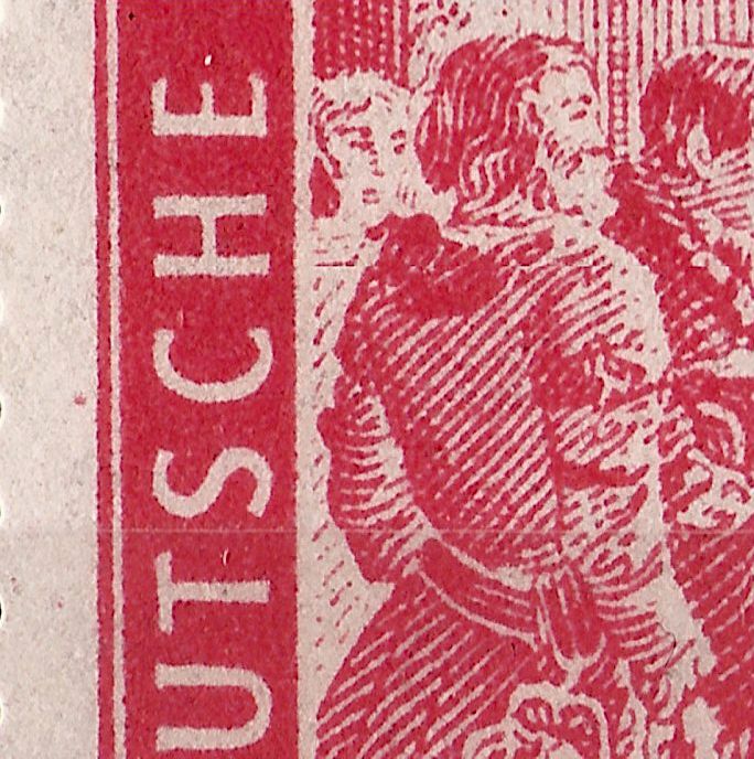 Postfrische Einzelmarke mit Michel-Plattenfehler XIV: Farbfleck im Rücken des links stehenden Mannes (Feld 24, Teilaufl.).