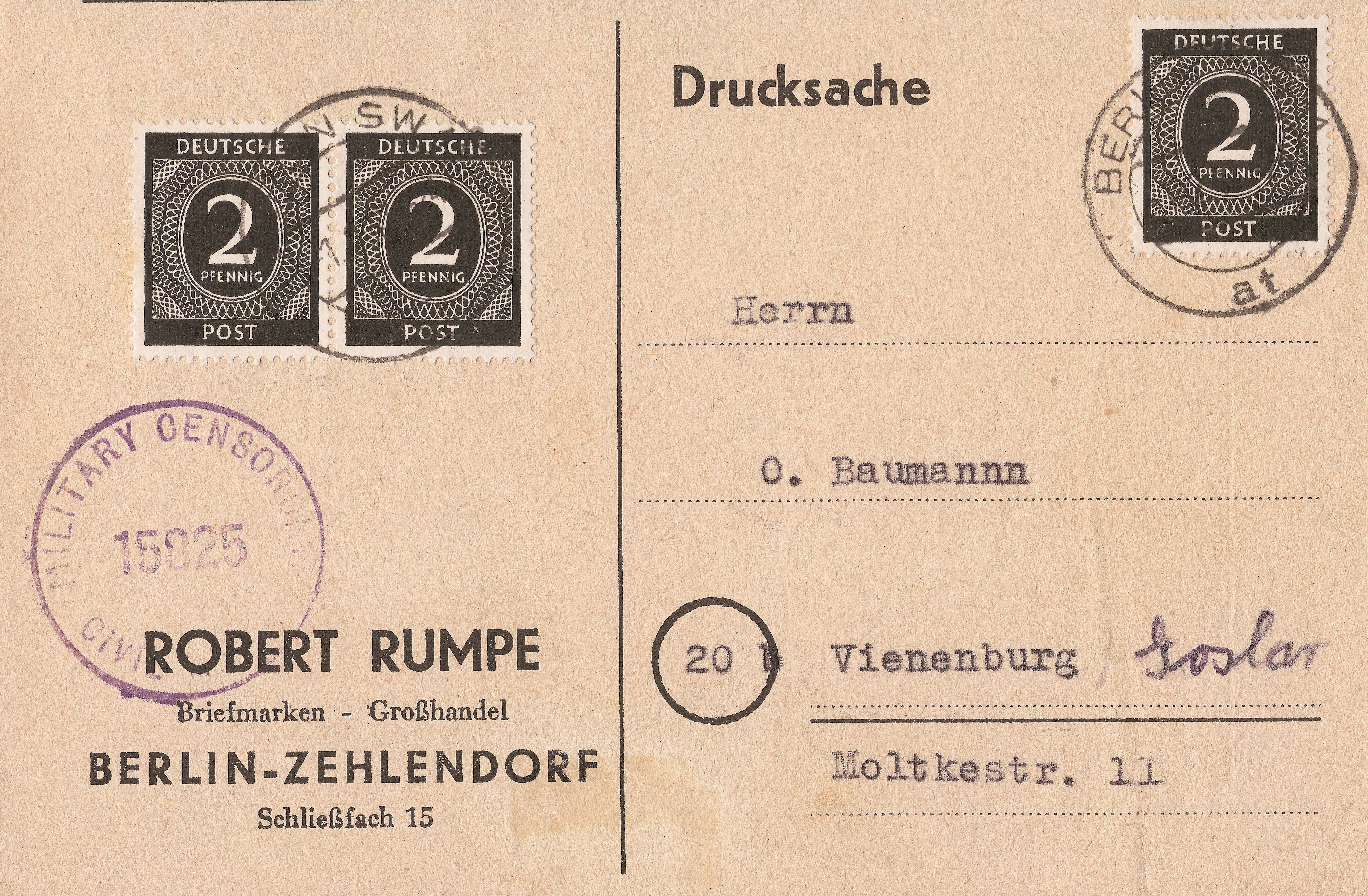 Portogerechte Mehrfachfrankatur der MiNr. 912 a auf Drucksache vom 1.2.1947 von Berlin nach Vienenburg. Die Karte wurde in der Zensurstelle Peine zensiert, was die Prüfernummer 15 825 belegt. Obwohl die Zensurstelle in Peine am 1. Februar 1947 eigentlich nicht mehr existierte bestand dort auch nach Schließung der Zensurstelle noch für geraume Zeit eine Abwicklungsstelle, die auch ausnahmsweise noch Post zensierte, die nicht nach Bonn oder Hamburg umgeleitet wurde.