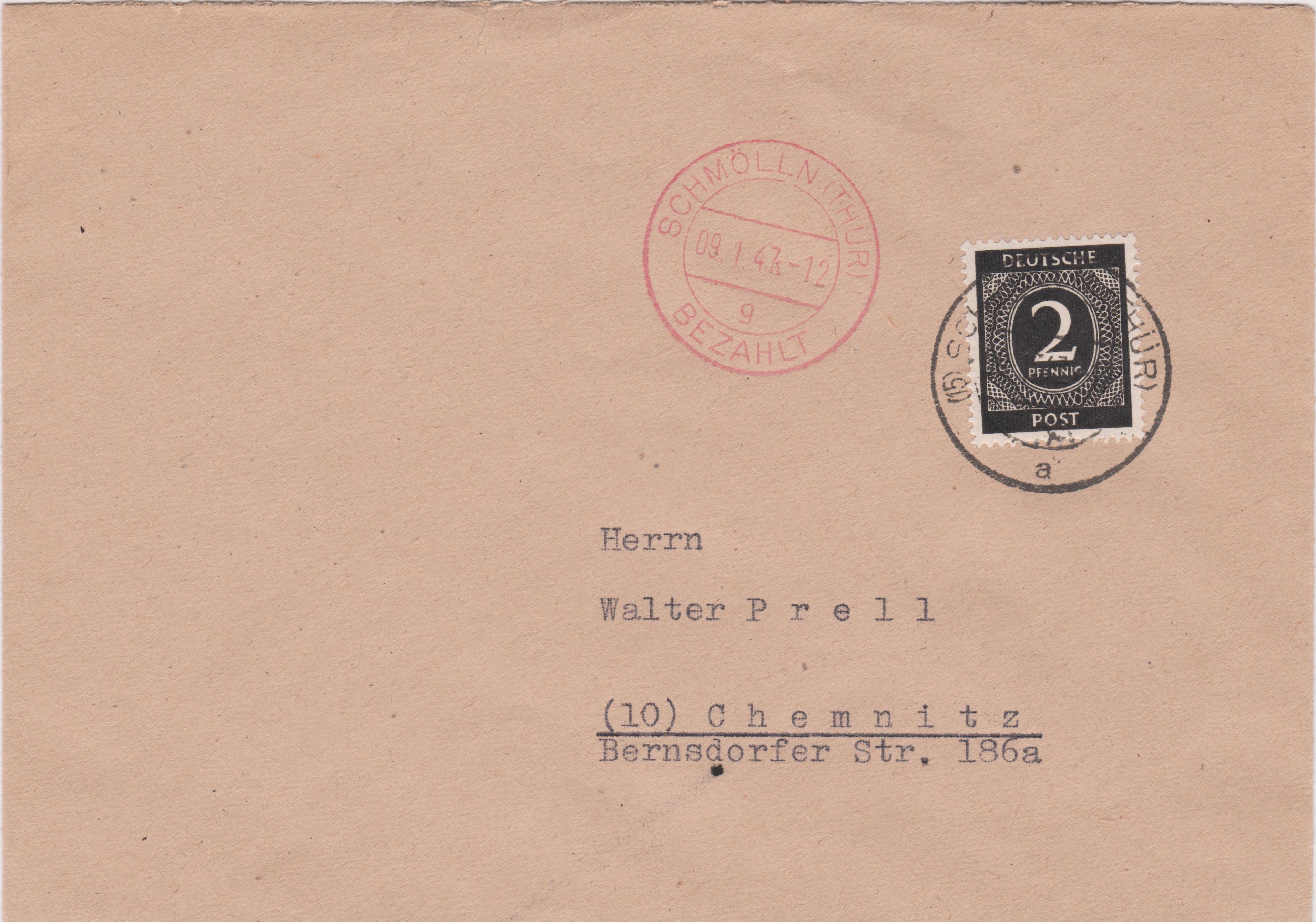 Dieser nach "(10) Chemnitz" adressierte Brief wurde am 09.01.1947 in "(15) SCHMÖLLN" in Thüringen aufgegeben: