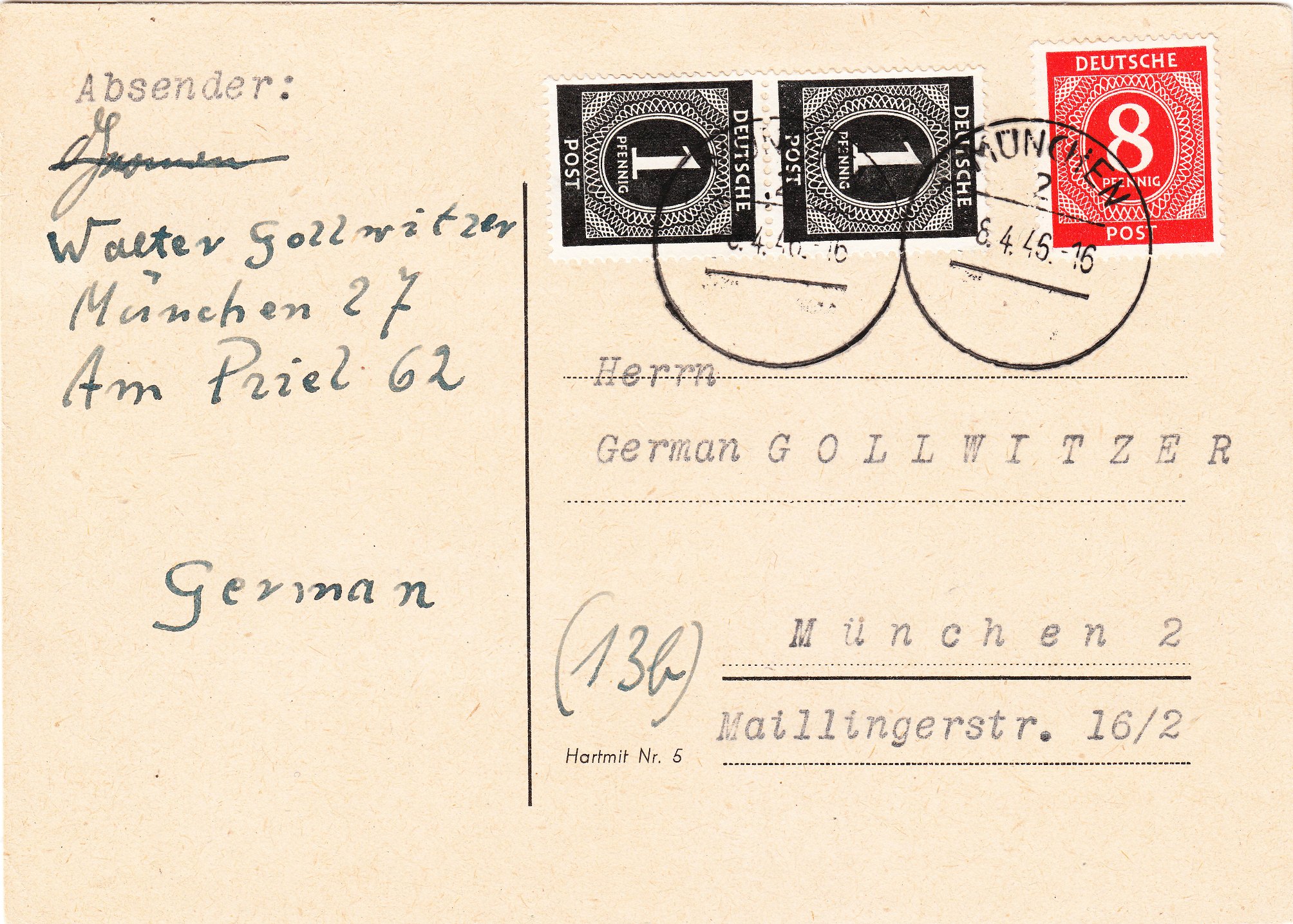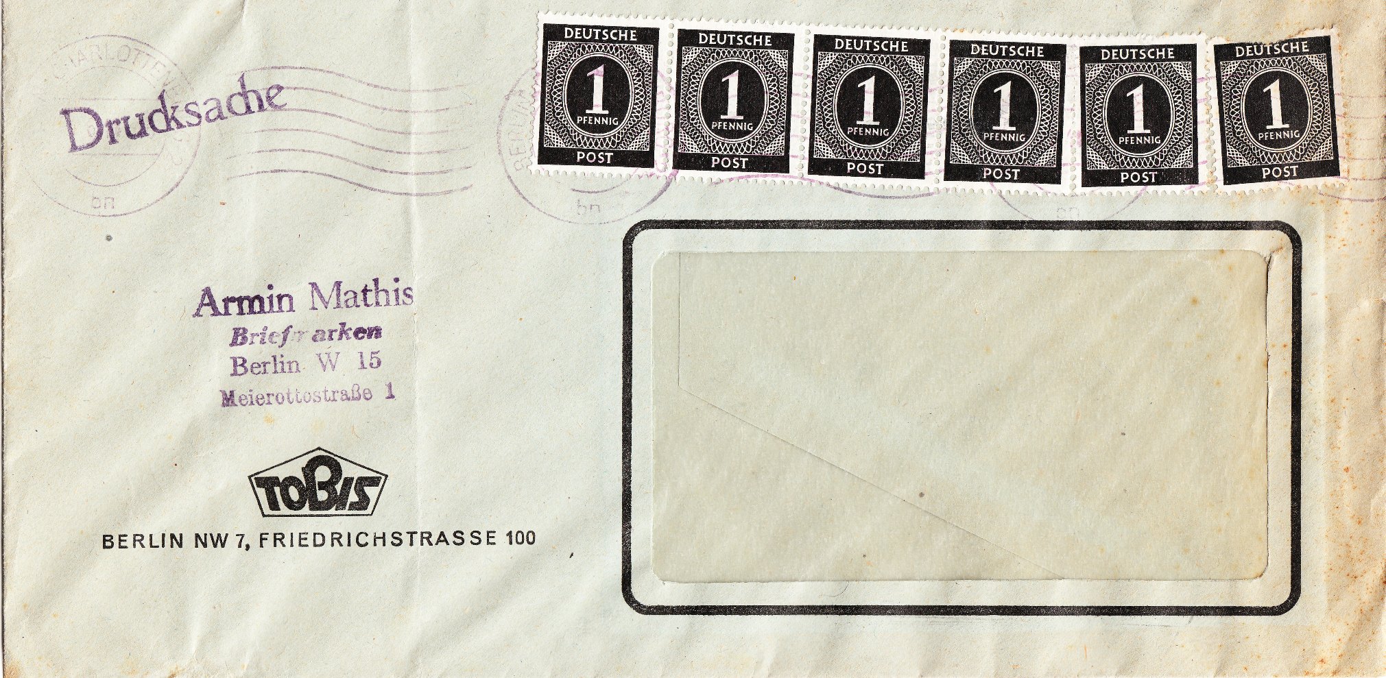 Ab dem 01.03.1946 verdoppelten sich die Portosätze, so dass eine Drucksache dann 6 Pfennig Porto kostete.