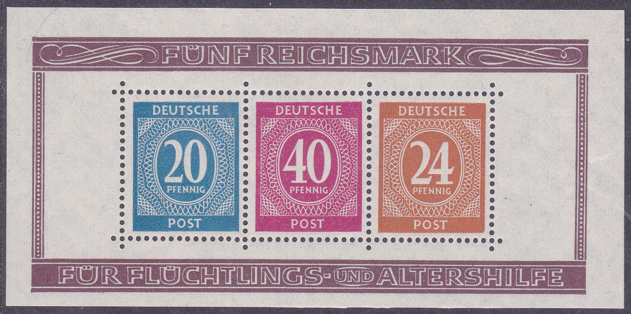Am 8. Dezember 1946 ist eine Blockausgabe zur ersten Briefmarkenausstellung in Deutschland nach Kriegsende erschienen. Er enthält drei Marken der I. Kontrollratsausgabe in den Wertstufen zu 20, 24 und 40 Pf. Der Block wurde nur in Verbindung mit einer Eintrittskarte (1 Mark) zu insgesamt 6 Reichsmark verkauft. Der Zuschlag (416Pf) diente zur Unterstützung der Flüchtlings- und Altershilfe.