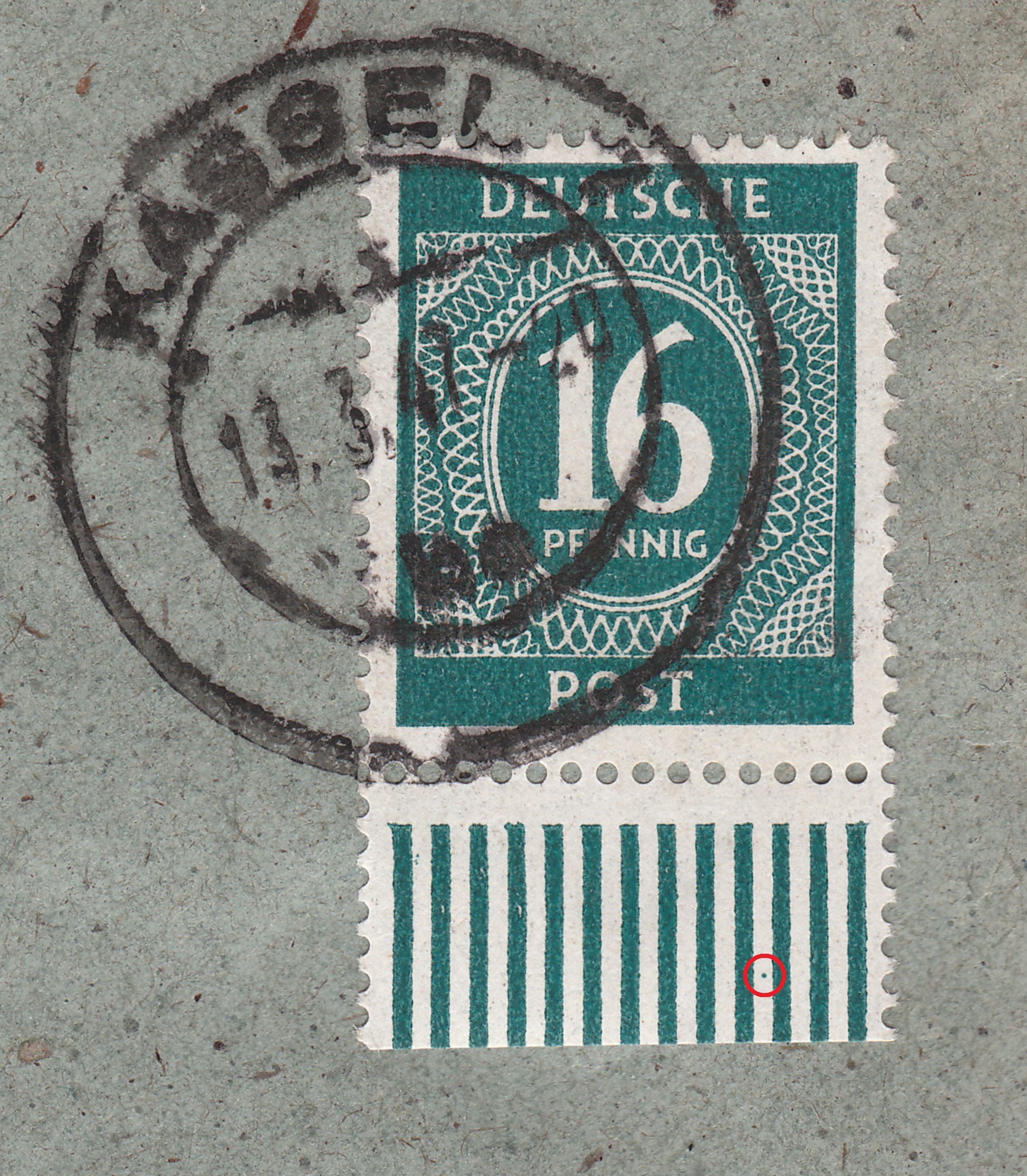 Diese als EF auf einem Ortsbrief bzw. als Geschäftspapiere verklebte MiNr. 923 vom Unterrand zeigt zwischen dem dritten und vierten Walzenstrich von rechts einen Punkt in Markenfarbe: