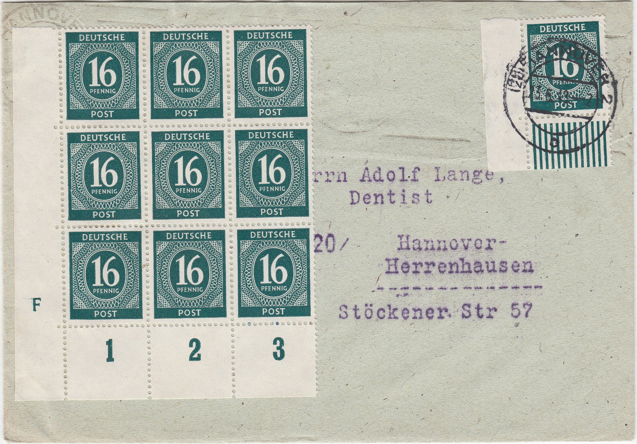 Dieser Ortsbrief (160 Pf) wurde, unter erneuter Verwendung eines bereits einmal verwendeten Briefumschlags, als portogerechte Zehnfachfrankatur, frankiert mit einer MeF der MiNr. 923, am 23.06.1948 nachts um 2 Uhr in Hannover 2 aufgegeben: