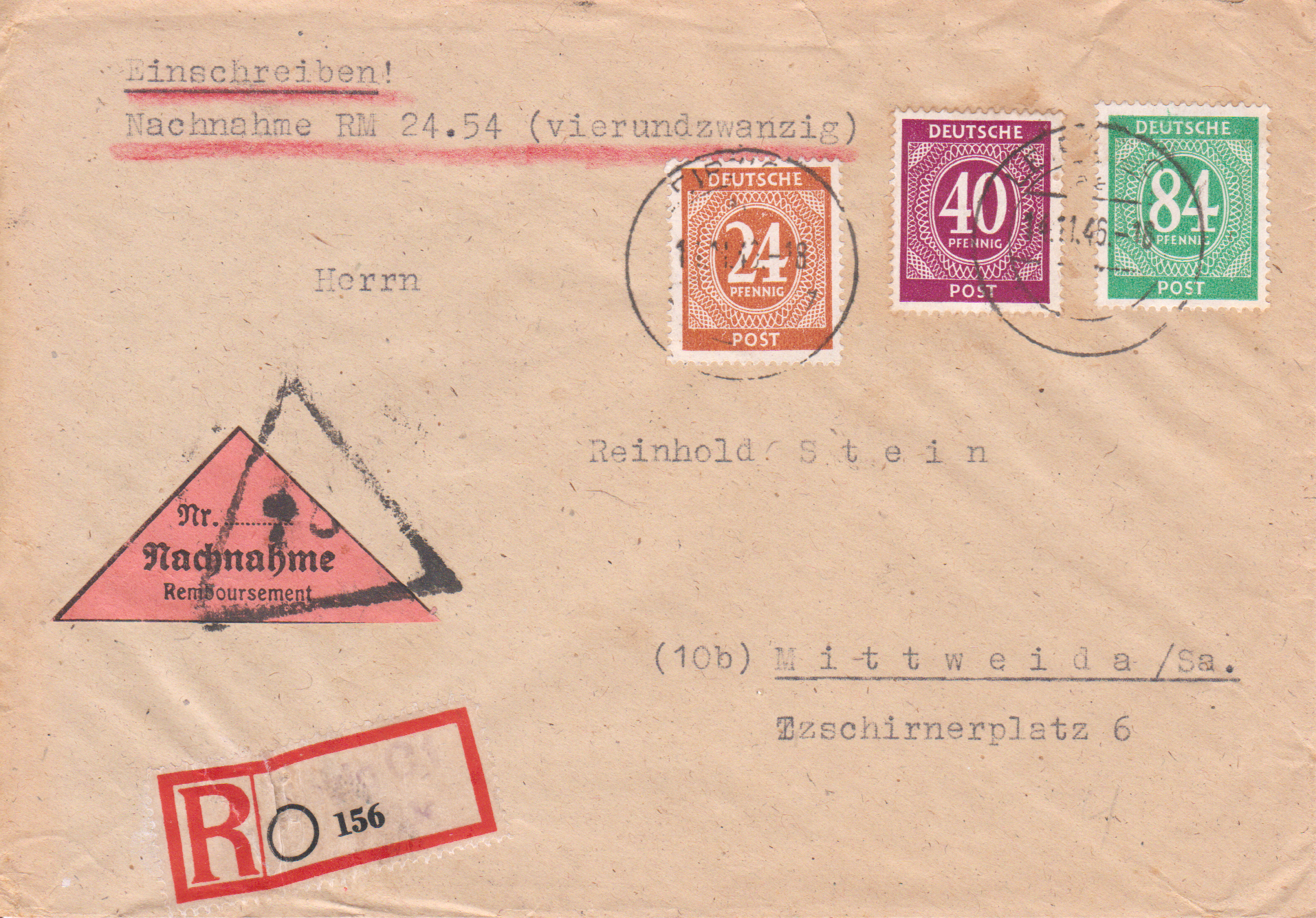 Mischfrankatur Ziffernserie 84 Pf, 40 Pf sowie 24 Pf, am 14.11.1946 portogerecht auf Brief der zweiten Gewichtsstufe, 48 Pf, per Einschreiben, 60 Pf sowie per Nachnahme, 40 Pf: