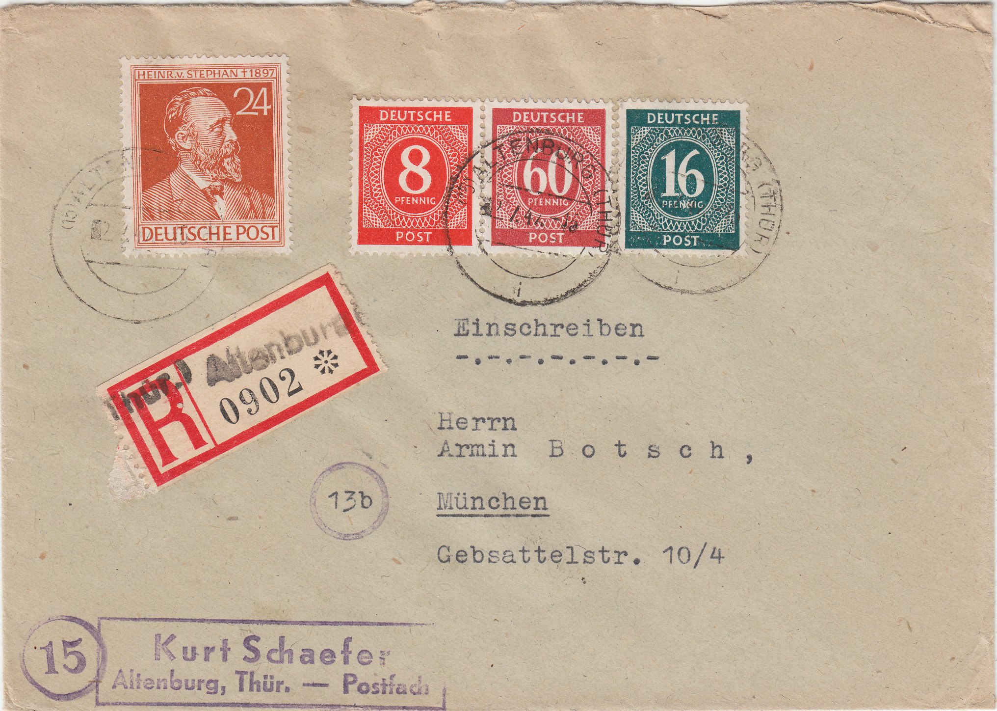 Den Anfang macht dieser Fernbrief der zweiten Gewichtsstufe (48 Pf) per Einschreiben (60 Pf), der am 02.07.1947 portogerecht frankiert mit drei Werten der Ziffernserie sowie einer Sondermarke Heinrich von Stephan in Altenburg in Thüringen aufgegeben wurde: