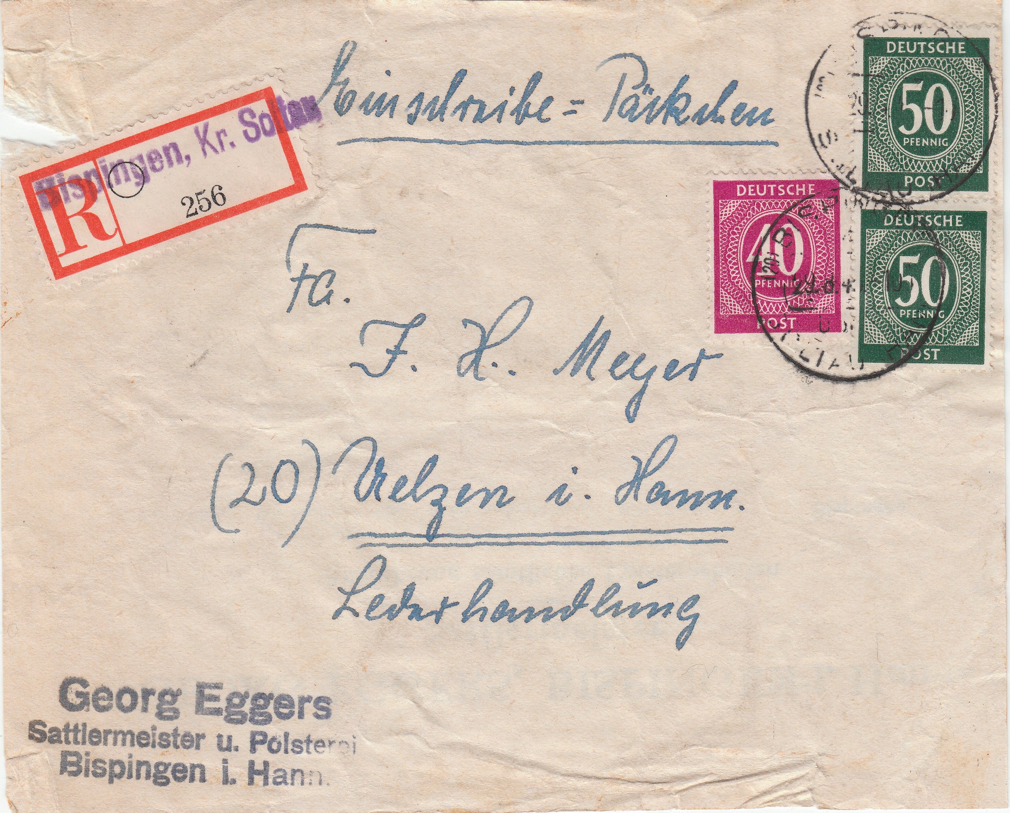 Ein Päckchen (80 Pf) per Einschreiben (60 Pf) ergibt die Portostufe 140 Pf, hier portogerecht dargestellt mit zwei Werten der Ziffernserie zu 50 Pf sowie einem Wert zu 40 Pf: